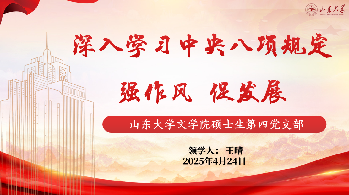 为深入学习和贯彻落实中央八项规定及其实施细则精神,以优良的党风凝心聚力,同时全面贯彻党的教育方针,汇聚起强国建设、民族复兴的青年力量,4月23日晚,248cc永利集团硕士研究生第四党支部于知新楼A606展开“学思想强作风,共同奋进新征程”主题读书会。活动由党支部书记郝展韬主持,共40余名党员及积极分子参与交流和学习。