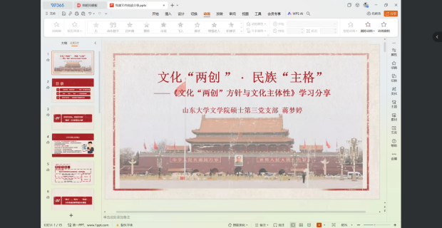248cc永利集团蒋梦婷、山东大学历史学院与考古学院硕士生第三党支部郑璐露和南京师范大学文学院王文欣进行领学。蒋梦婷领学《文化“两创”方针与文化主体性》一文,阐述了“两创”方针的基本内涵、“两分”“两为”“两创”的历史脉络以及如何辩证地构建中华民族现代文明;郑璐露领学《把中国文明历史研究引向深入 增强历史自觉坚定文化自信》一文,从中华文明探源工程说起,并从加强多学科联合、深化研究中华文明特质、推动中华优秀传统文化创造性转化、创新性发展以及推动文明交流互鉴四个方面论述持续推进中华文明探源工程的具体路径;王文欣领学《文化“两创”方针与文化主体性》一文,从“两创”方针的基本内涵,方针的演进脉络和历史逻辑,方针的重要意义三方面展开,指出中华民族现代文明兼具民族性和时代性。