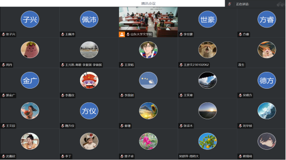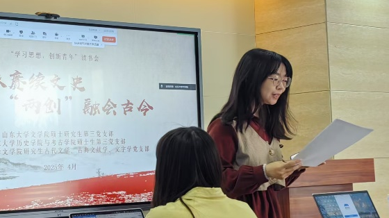 随后,山东大学历史学院与考古学院硕士生第三党支部书记朱海月和南京师范大学文学院研究生古代文学、古典文献学、文字学党支部书记江明蔚发言。朱海月认为,强基才能固本,行稳才能致远,读书会的研习交流锻炼了同志们的话语表达和辩证思维能力,有助于同志们提升思想觉悟,激发基层党组织在人才培养与思想引领方面的复合功能;江明蔚指出,本次读书会以“两创”为锚,以青年为帆,启发了大家对于激活传统文化生命力的思考,并呼吁大家积极投身于中华优秀传统文化的传承与传播,将个人追求与时代发展相结合。