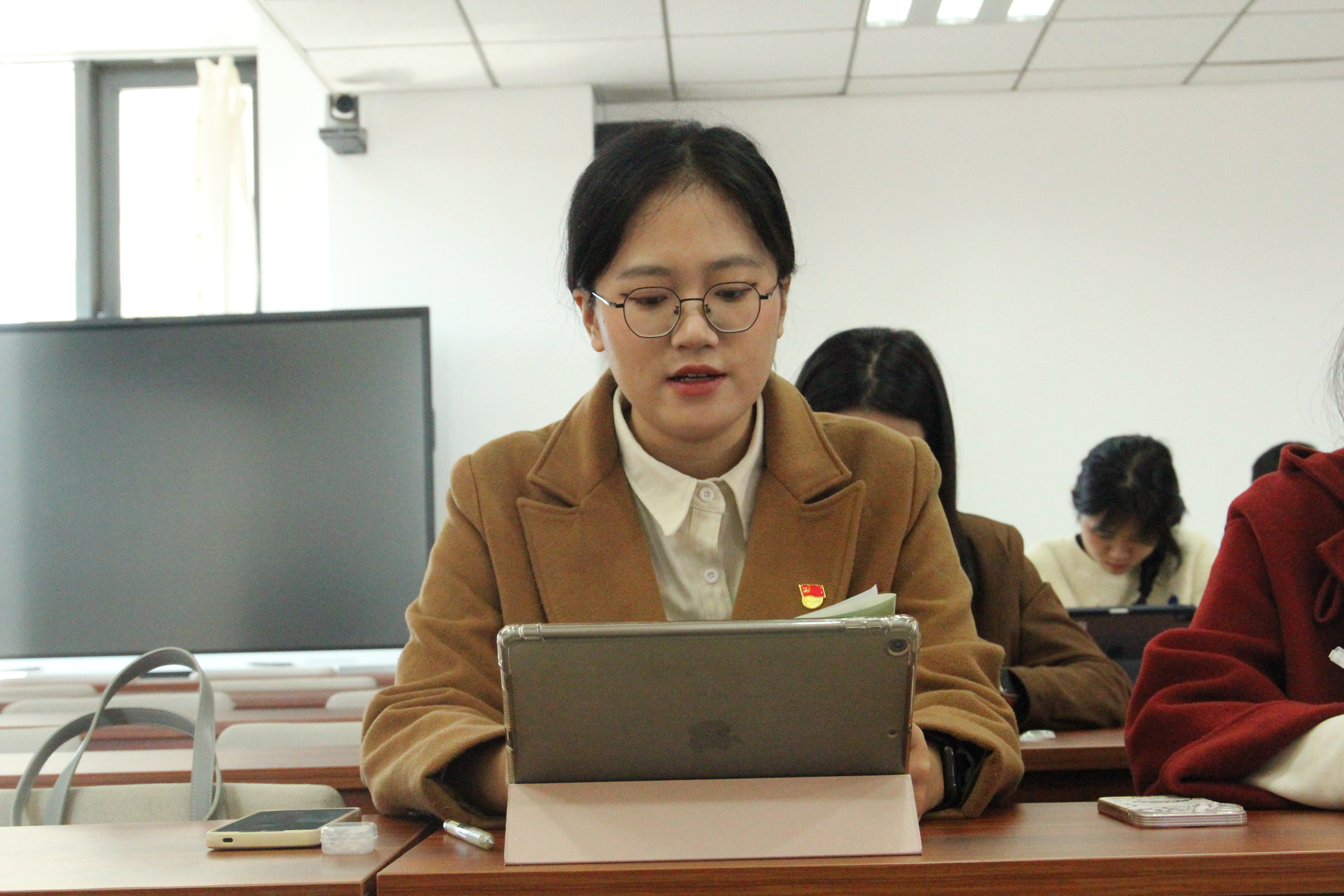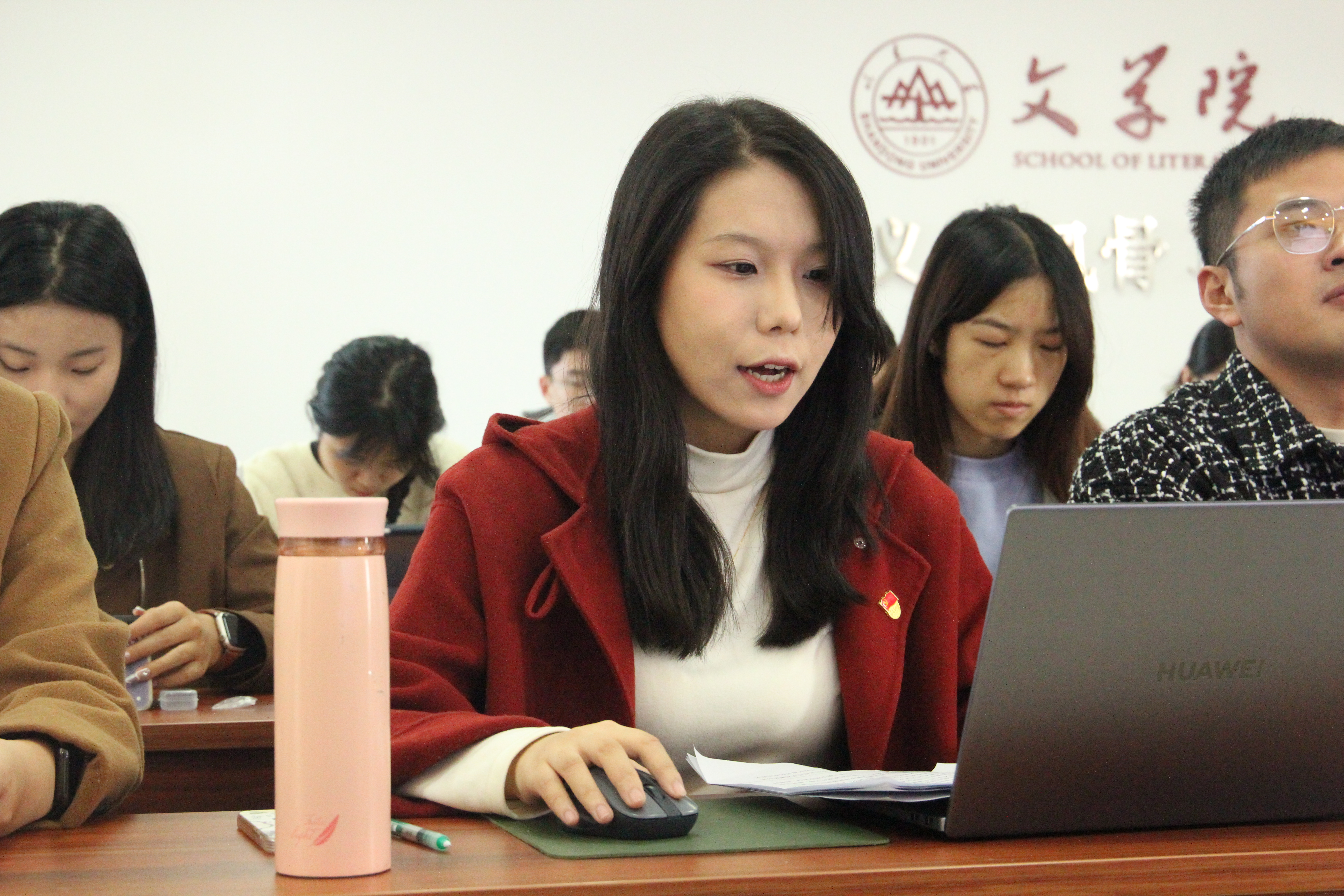 随后,活动进入党员代表领学环节。中国海洋大学闫雯以“立德树人初心不忘,山海百年踵事增华”为主题,带领大家条分缕析地研读了五篇重要讲话文章的主要内容,分享了中国海洋大学百年来在立德树人、强国建设中的丰富经验和显著成就。接着,我院李亚超以“山海万里百年志,东方风来文化新”为主题,介绍了山东大学在保护文化遗产、传承传统文化、弘扬时代精神方面的卓越贡献。她鼓励大家要坚守中华文化立场,立足当代中国现实,永远坚持为人民服务、为社会主义服务的理念,用实际行动铸就中华文化的新辉煌。