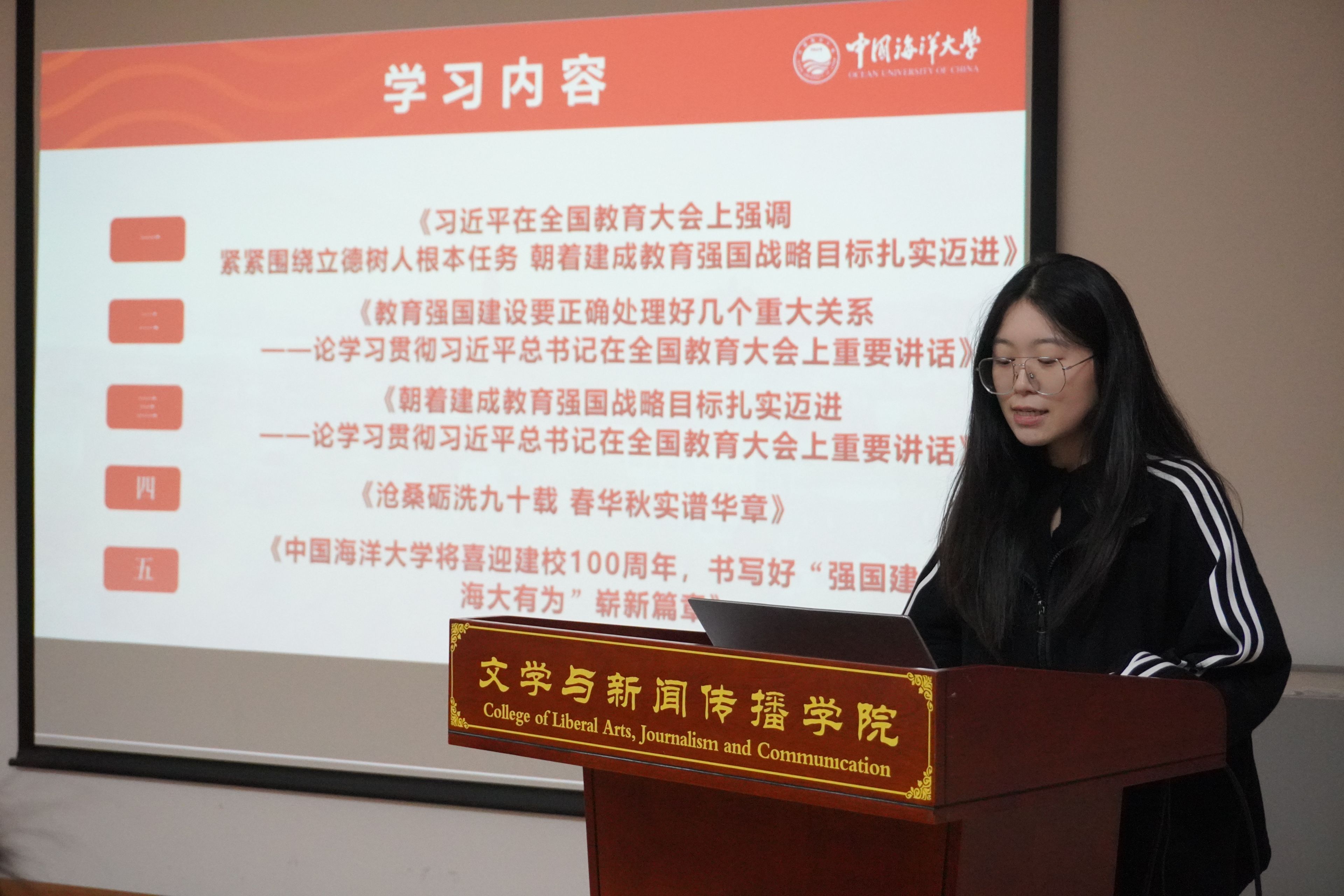 在党员同志分享心得环节,我院刘欣根据闫雯同志的领学内容,结合个人学习感想,就如何锻造好习近平总书记在全国教育大会上提出的“六个力”作进一步探讨。她从学院里的点滴小事入手,以一个个生动鲜活的实例深入浅出地分析了思政引领力、人才竞争力、科技支撑力、民生保障力、社会协同力和国际影响力的具体内涵,鼓励大家为教育强国建设贡献青春力量。而中国海洋大学董芯宇则根据李亚超同志的领学内容,围绕习近平总书记在文艺工作座谈会上的讲话,就“中国精神是社会主义文艺的灵魂”这一主题进行了分享。她表示,作为文学与新闻传播专业的青年党员,要深刻理解和把握中国精神的内涵,结合专业所学,创作出更多反映时代精神的优秀作品,坚守艺术理想,追求德艺双馨。