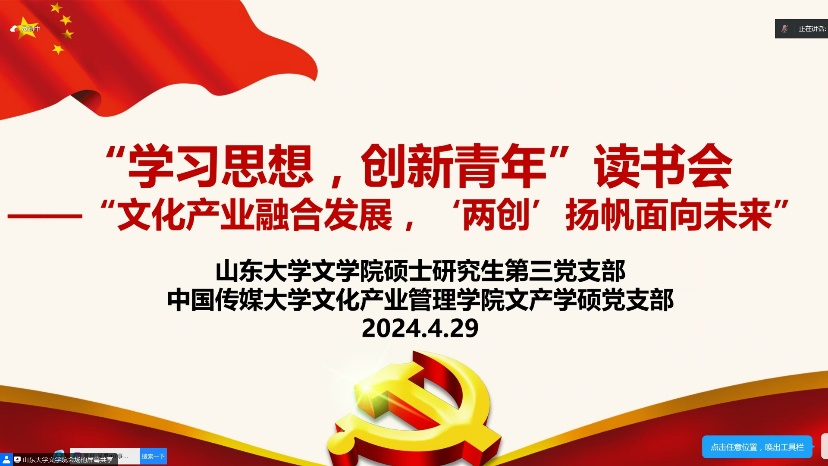 为深入学习贯彻习近平文化思想,4月29日上午,248cc永利集团硕士研究生第三党支部和中国传媒大学文化产业管理学院学术硕士党支部联合开展“学习思想,创新青年”2024学年春季学期第一期读书会,主题为“文化产业融合发展,‘两创’扬帆面向未来”,共50余名党员参会。活动由248cc永利集团硕士研究生第三党支部书记崔蕊主持。