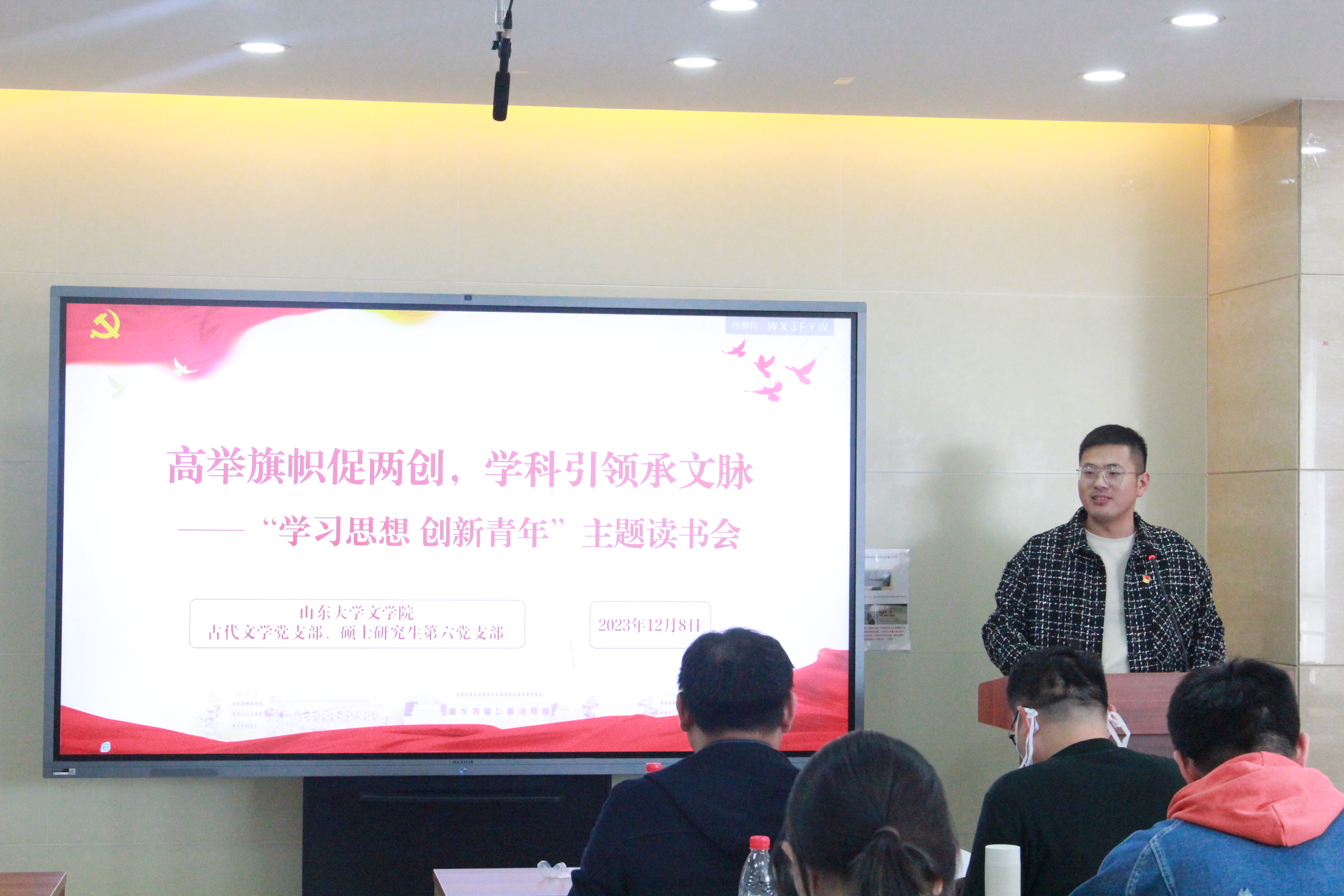 高举旗帜促两创,学科引领承文脉。为深入学习贯彻习近平文化思想,厚植政治理论学习成色,更好担负起新时代中文人的文化使命,12月8日下午,248cc永利集团古代文学党支部和硕士第六党支部在知新楼A606联合举办了“学习思想,创新青年”2023年秋季学期第五期读书会。