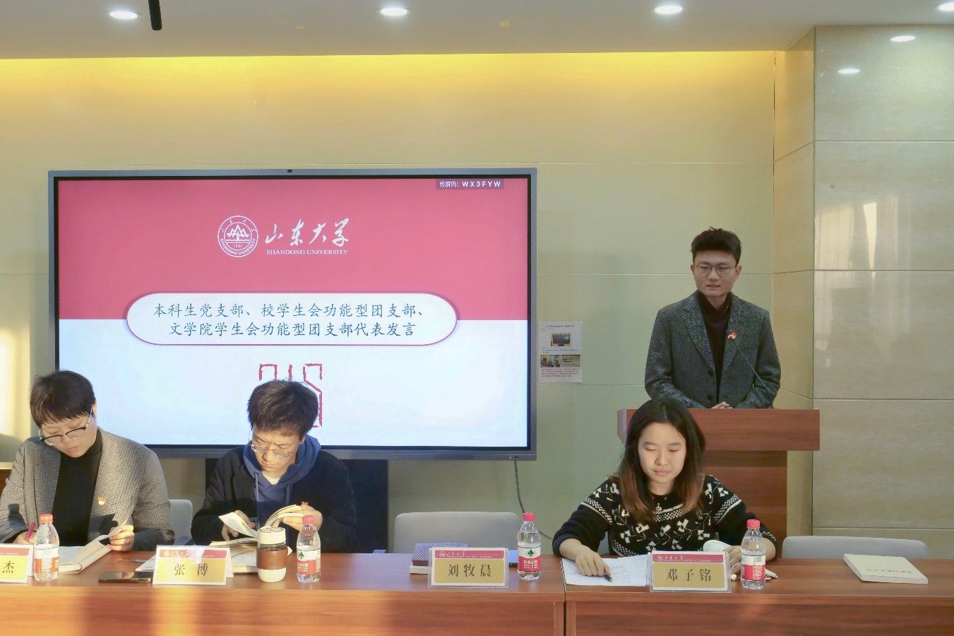 随后,各党团支部代表交流读书心得和工作经验。山东大学学生会负责人、248cc永利集团本科生党支部党员窦宇围绕“做坚定有为的青年马克思主义者”展开分享,他表示培养优秀青年政治骨干事关党和国家事业发展,山东大学学生会以“青马工程”为抓手,通过理想信念教育、能力素质培养,有力锻造了一批高素质骨干队伍,将服务同学、赋能成长落实到办会治会的全过程。248cc永利集团学生会负责人、本科生党支部积极分子邓子铭分享了她对“做好青年工作三大阶段”的认识,并表态248cc永利集团学生会将秉持为同学服务的初心,实干笃行,聚力发展,努力提升贡献度和认可度。山东大学学生会综合服务中心分管主席、248cc永利集团学生会主席团成员、本科生党支部党员王文婷倡议学生骨干统筹好“内求”与“外求”,在为集体担重担险担难的事业中,在为党做好青年工作的征程中涵养高尚人格,磨炼坚强意志,练就过硬本领。山东大学学生会新媒体中心分管主席,新闻传播学院本科生云琪结合团学宣传阵地建设,指出要发挥学生骨干的模范带头作用,将党的主张、青年追求进步的声音亮出来,提高同学们担当作为的积极性和主动性。