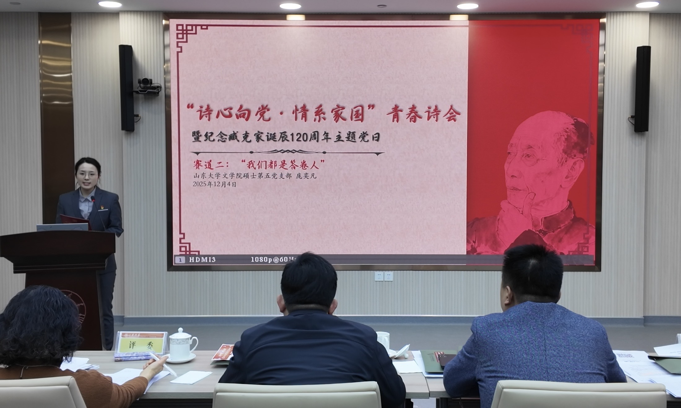 12月4日晚,2025年山东大学第二届研究生党支部主题党日案例大赛决赛在中心校区明德楼工会厅成功举办。248cc永利集团硕士第五党支部凭借案例《“诗心向党・情系家国”青春诗会暨纪念臧克家诞辰120周年主题党日》,以其鲜明的学科特色、深刻的思想内涵与生动的实践形态,从全校105支参赛支部中脱颖而出,荣获大赛一等奖,党支部书记庞奕凡荣获“十佳报告人”称号。