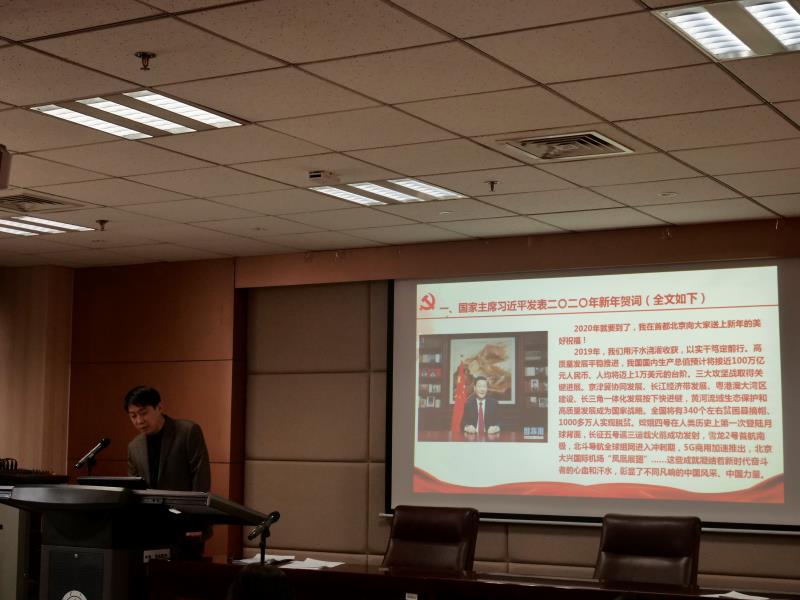 会上,张帅首先带领大家学习了国家主席习近平发表的二〇二〇年新年贺词。他指出,习近平总书记的新年讲话言辞质朴,感情深厚;贺词中串联的大事件与小事情,既有高度也有温度。张帅选取了习近平总书记在新年贺词中具有代表性的金句,对“我们为共和国70年的辉煌成就喝彩,被爱国主义的硬核力量震撼”“冲锋号已经吹响”“只争朝夕,不负韶华”等做了有力的阐释。他强调,习近平总书记的新年贺词充满信心与斗志,见证情怀与担当,希望全体教职工能深入领会贺词精神,不忘初心,立足岗位,不断提升学院教育教学水平。