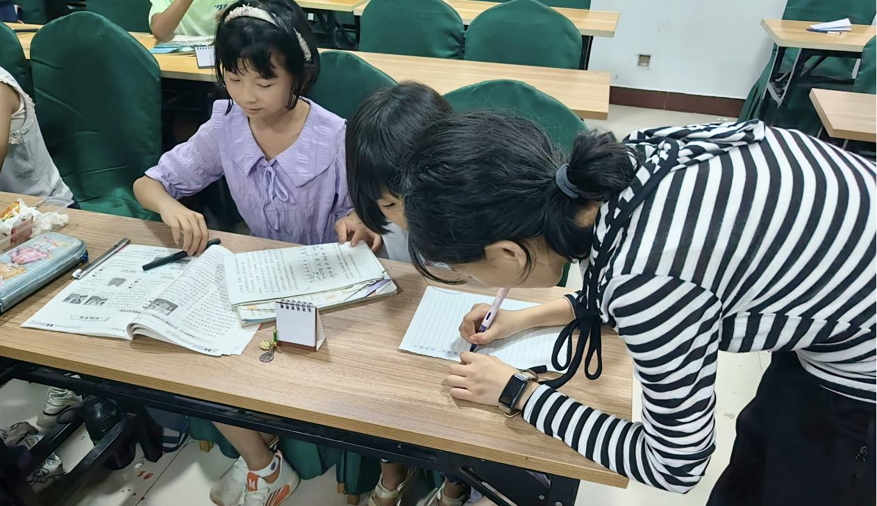 次日,支教团队针对湖头镇17名乡村孩童开展点对点课业辅导,提升孩子们的学习能力与信心。同时团队开展艺术启蒙课堂,通过击鼓传花、诗词背诵、盲盒礼物、剪纸创意制作等形式,填补当地乡村儿童艺术教育资源的空白。孩子们从一开始的羞涩到主动展示才艺,艺术感知力与表达力显著提升,丰富了乡村孩童的暑期文化生活。
