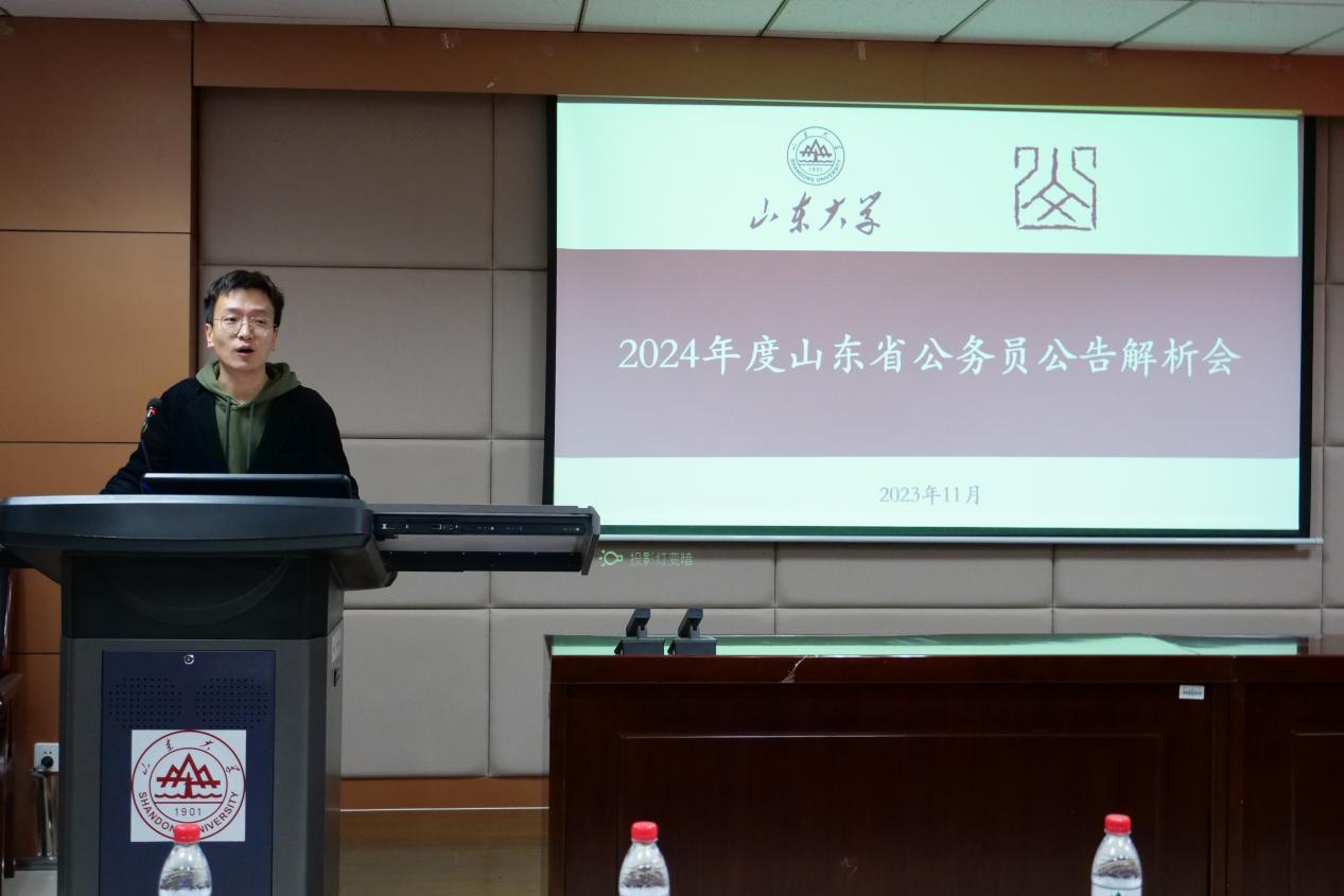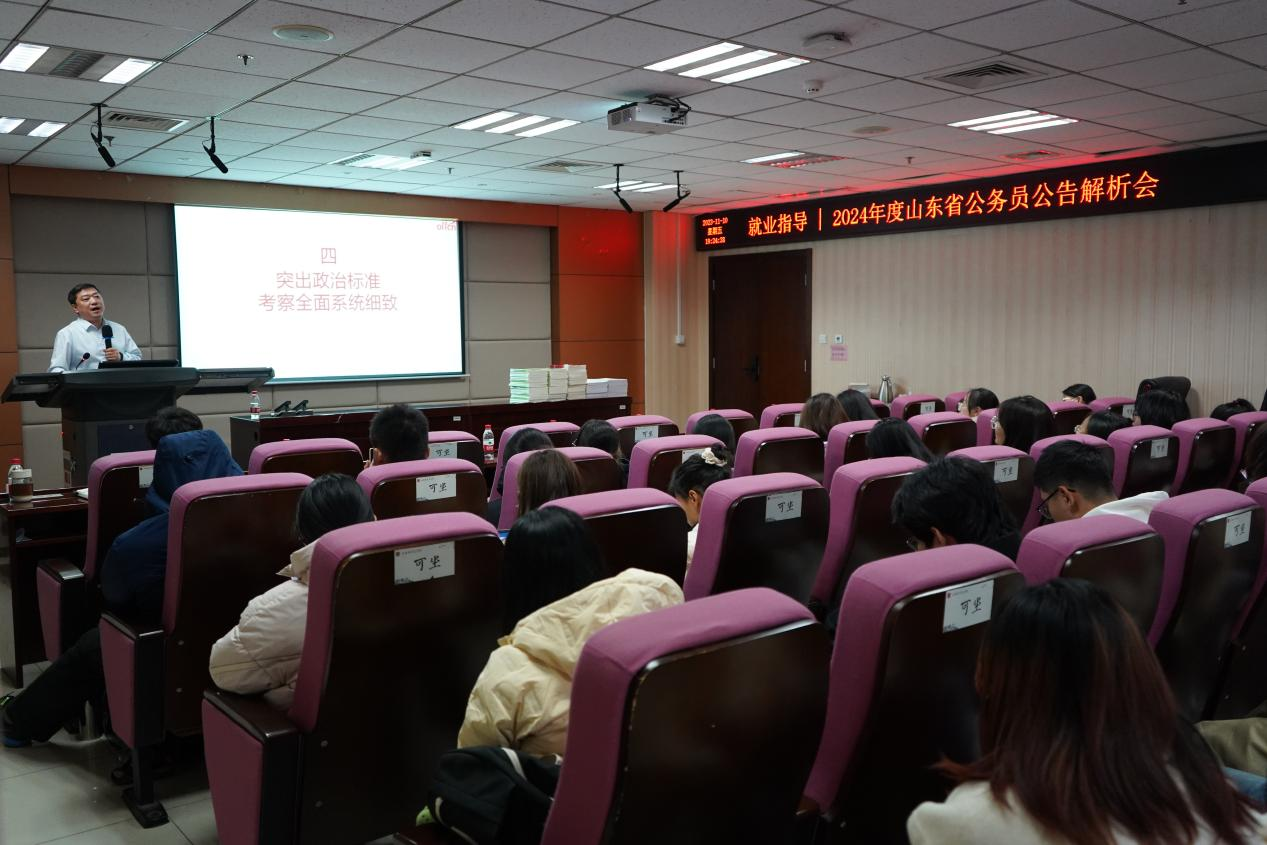 为帮助学生了解公考动态、把握就业形势、坚定备考信心,11月10日晚,248cc永利集团邀请中公教育副总裁、中公行测研究院院长李琳,于知新楼A620组织开展2024年度山东省公务员公告解析会。248cc永利集团本科生辅导员张博以及来自不同年级的一百余位同学参加此次活动。