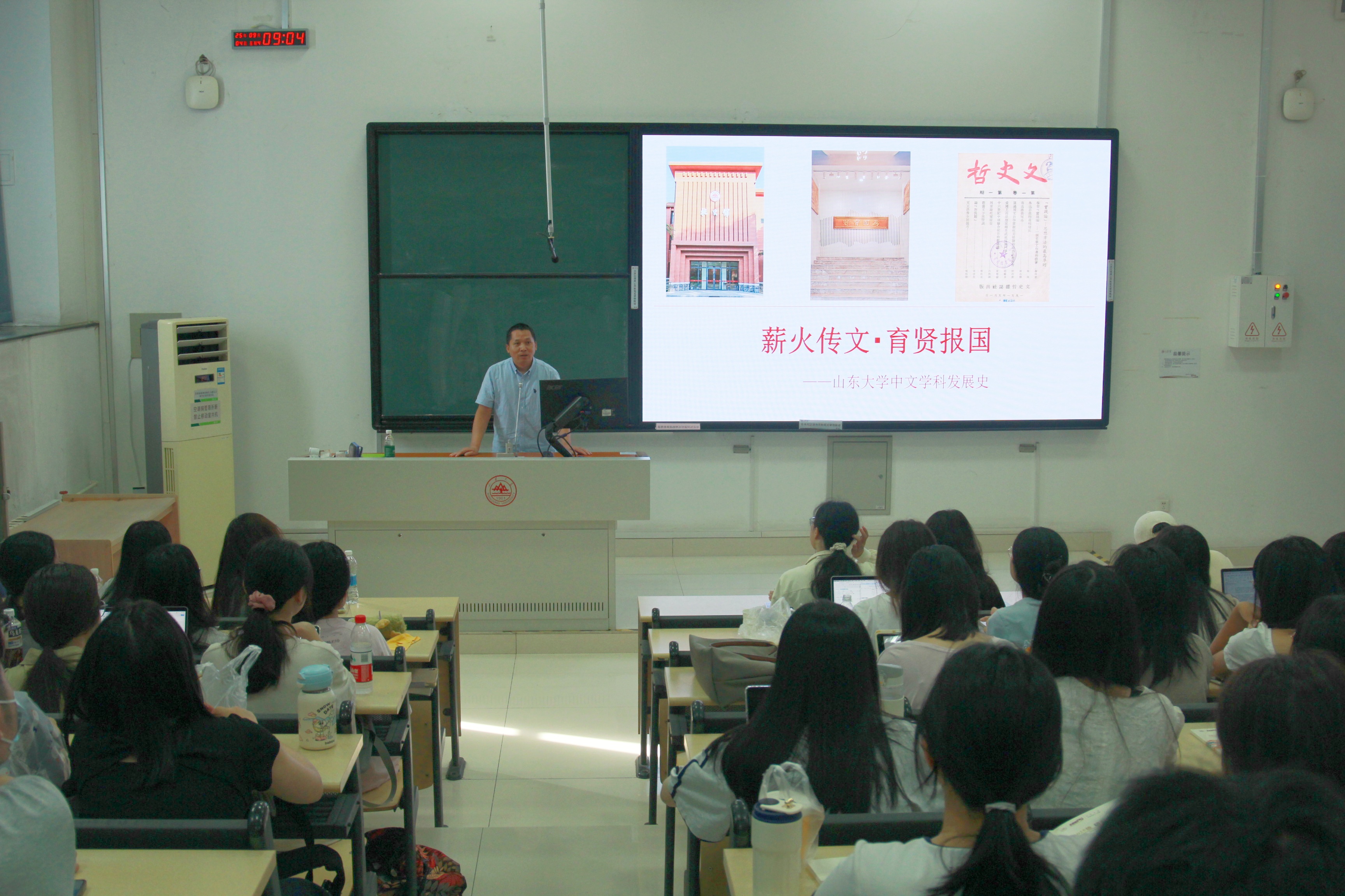 随后,张洪刚系统回顾中文学科与山东大学“同频共振、同步发展”的历史,梳理学院在不同时期历史沿革与院系调整中的变迁历程,让新生直观感受“山大中文与山大同行”的深厚渊源。他还重点讲述了闻一多、梁实秋、臧克家、高亨等山大先贤的治学轶事与人格风范,引导新生体悟前辈学者的家国情怀与学术担当。
