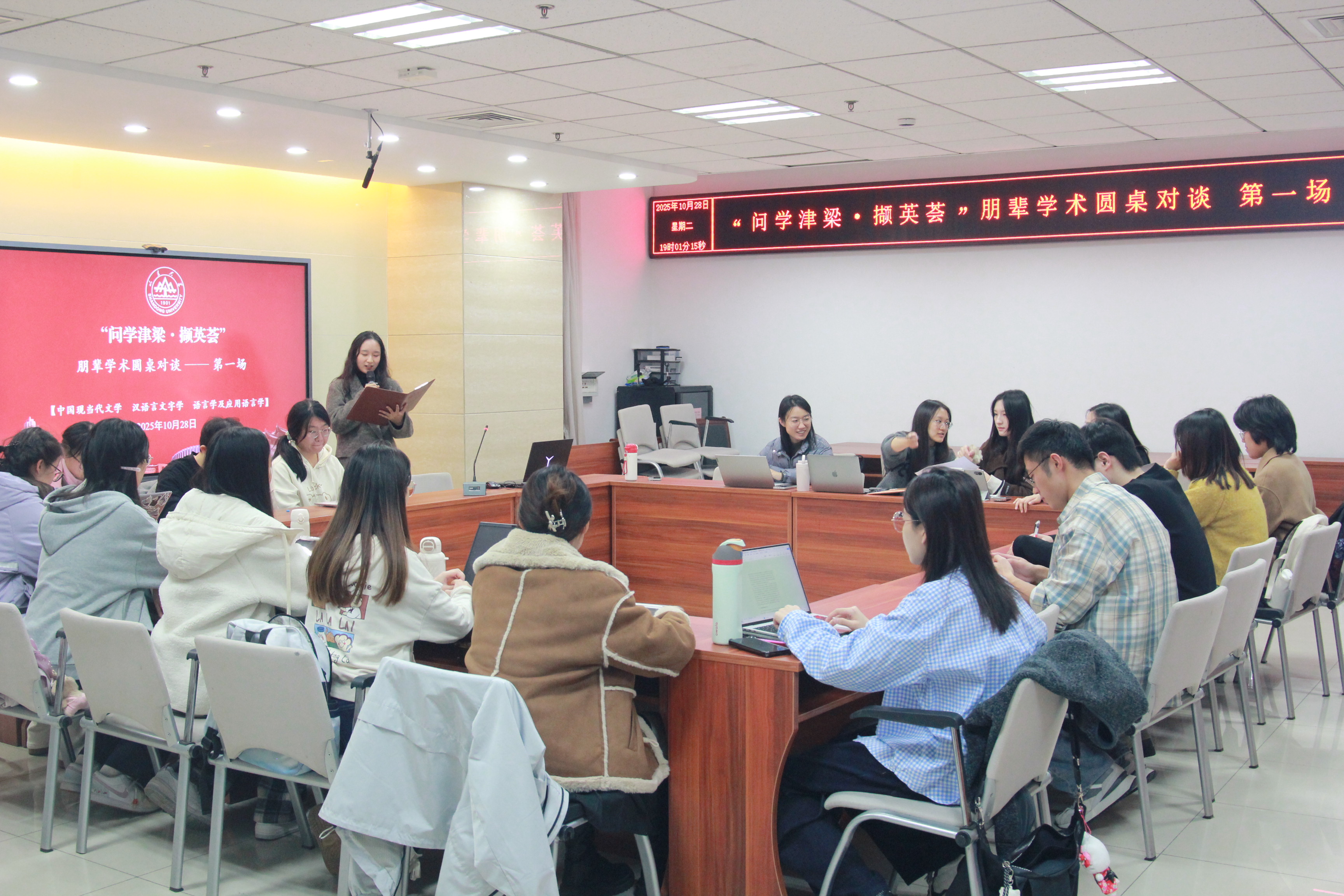 活动伊始,主持人岳婉婷指出,研究生阶段是知识深化与人格成长并行的关键时期,如何在课业与科研中找准节奏、搭建个人知识体系,是全体研究生面临的共同课题。首场“问学津梁·撷英荟”活动聚焦汉语言文字学、语言学及应用语言学、中国现当代文学三大专业方向展开分享。