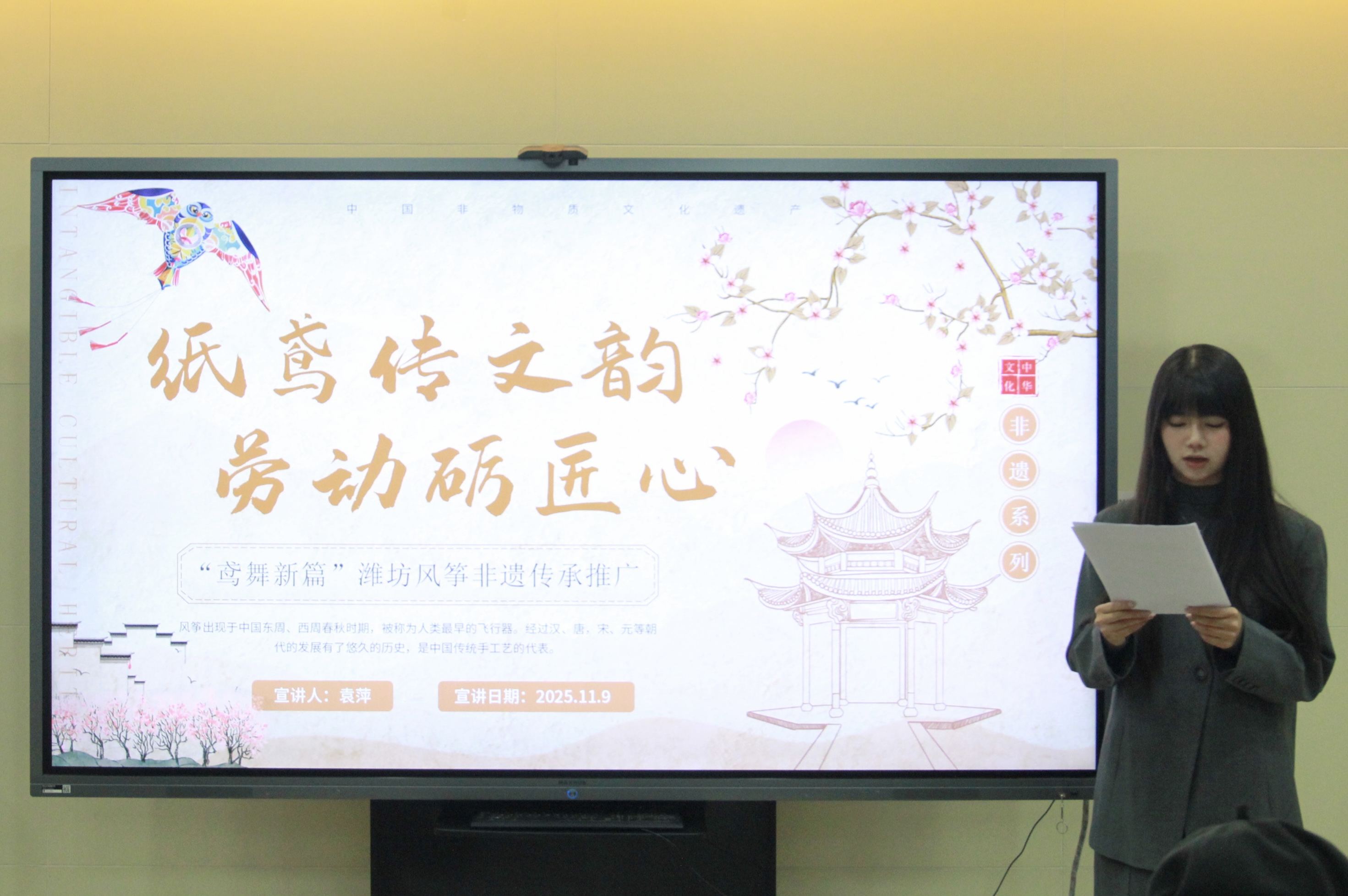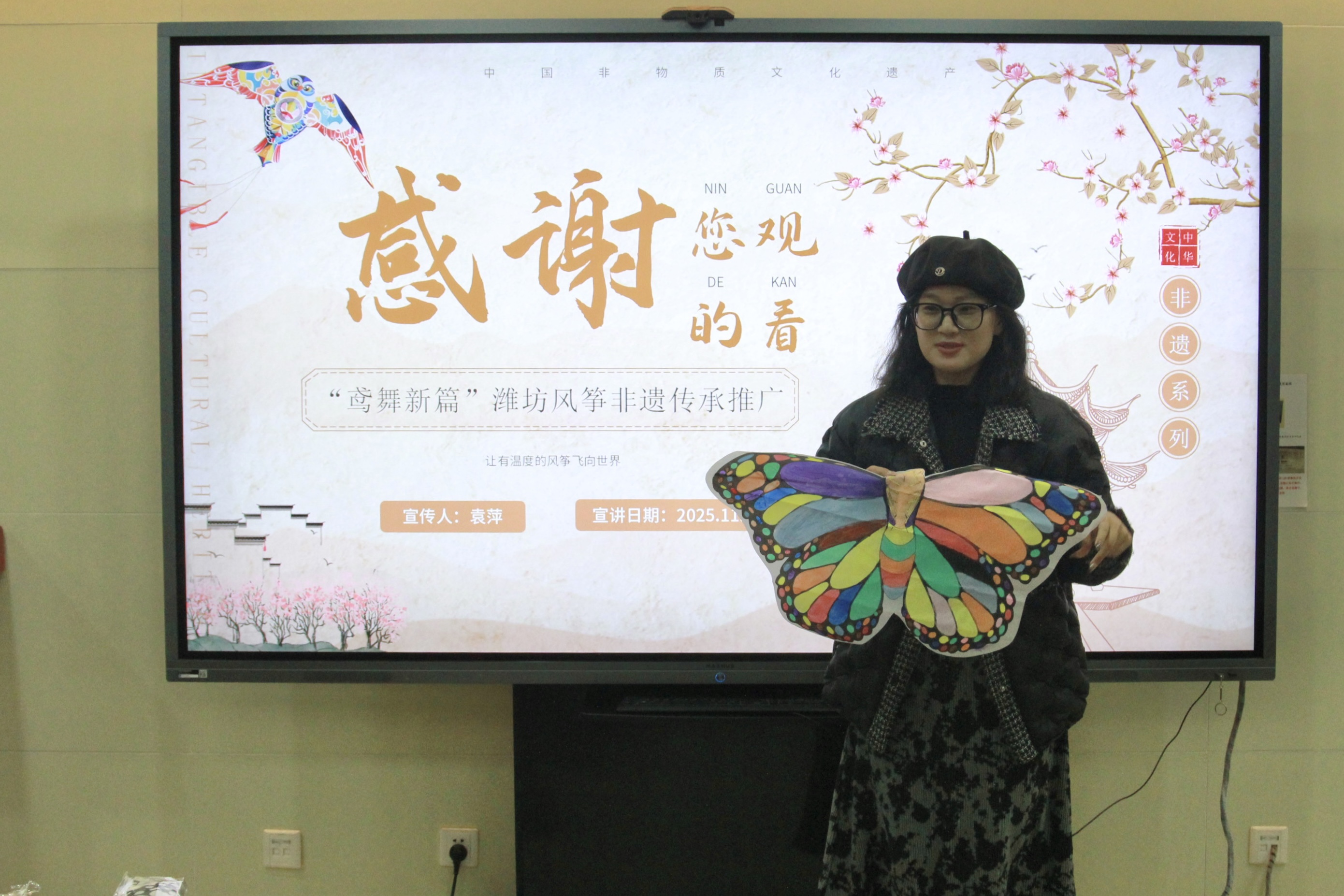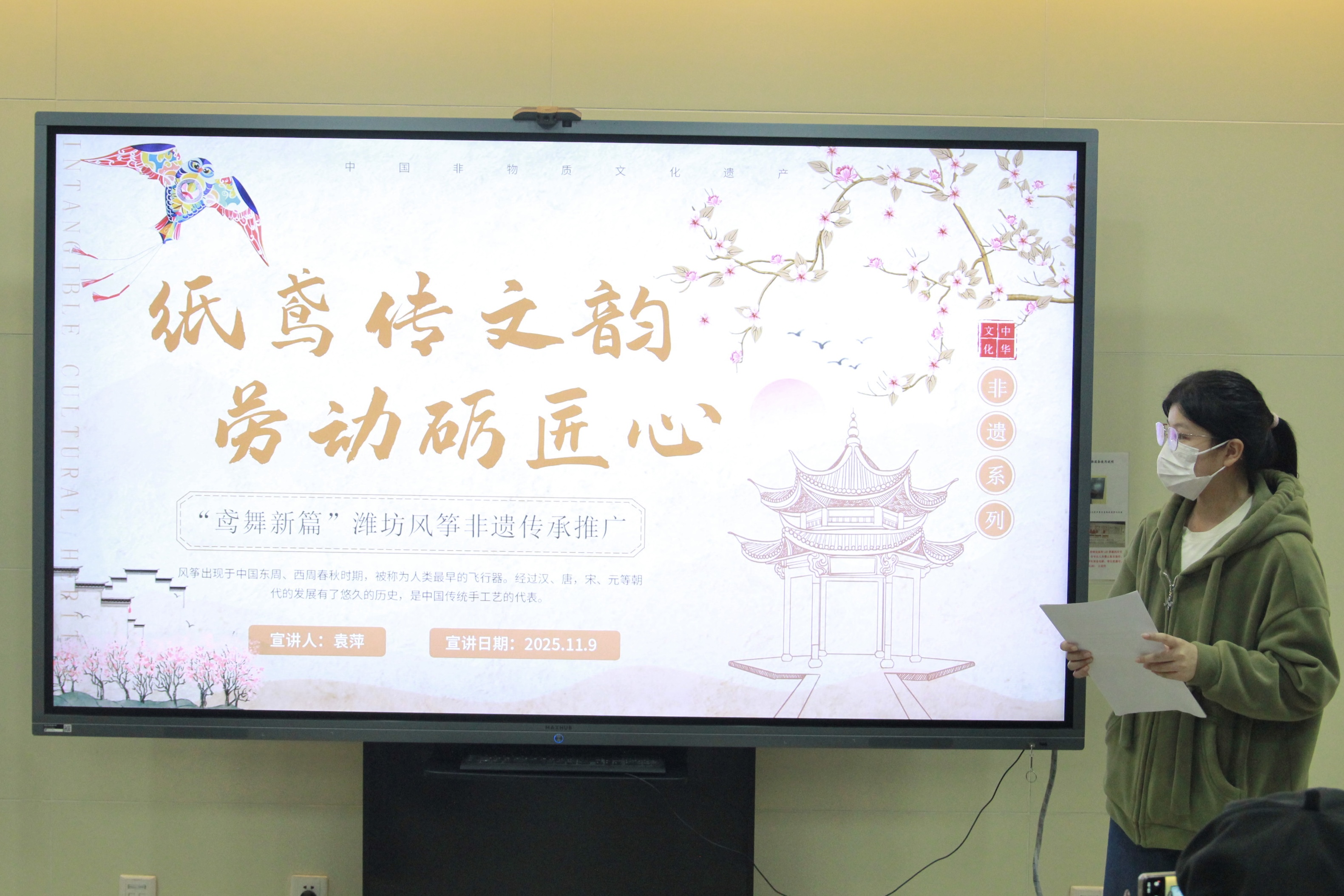 活动伊始,“鸢舞新篇”团队开展风筝文化主题宣讲。袁萍从历史渊源、工艺特征、工艺流程、传承保护四个维度,系统解读了潍坊风筝的文化内涵。在工艺讲解环节,她特别强调了“扎、糊、绘、放”四大核心技艺,为后续的动手实践奠定了扎实的理论基础。同时,团队呼吁大家关注非遗传承现状,共同守护这项承载民俗记忆与工匠精神的传统技艺。