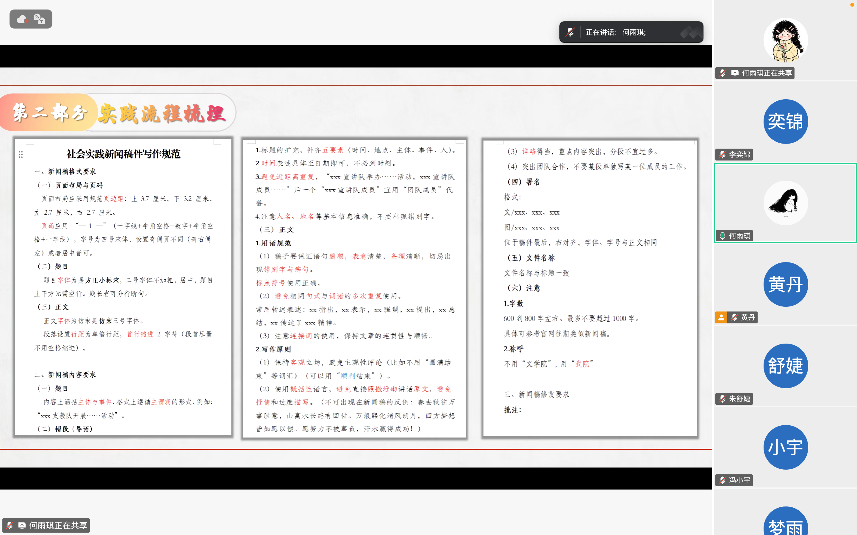 最后,何雨琪对立项选题、实践流程和评优材料准备三个方面展开了详细的讲解。她分析了校级与院级两种立项途径的难度,强调团队沟通协作和实践成果宣传的重要性,随后明确了实践时长、团队分工、证明材料及宣传稿、报告写作等有关要求,助力学生高效参与社会实践。