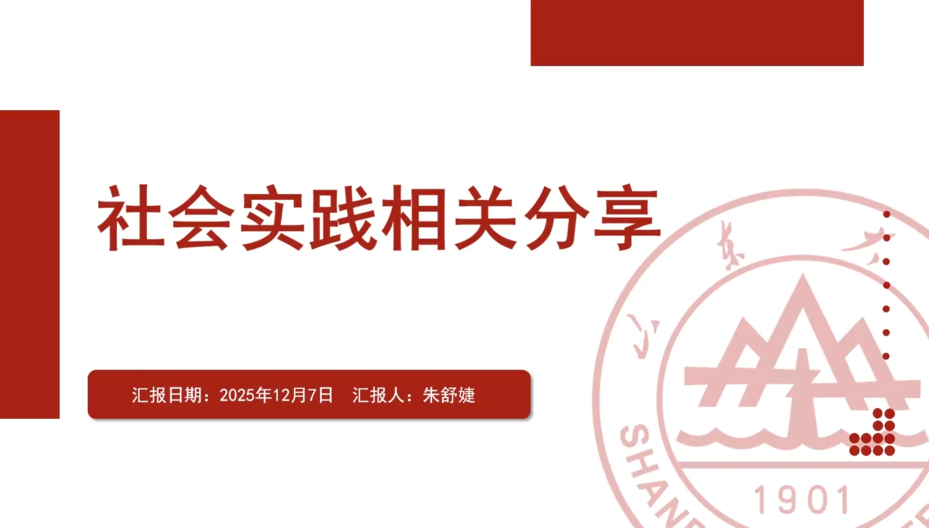 分享环节伊始,朱舒婕从具体流程、内容选题、实践过程、评优心得四个角度分享了社会实践的相关要点。她提出立项阶段可以选择校级或院级立项,将主题与实践内容结合形成内容选题,同时强调了实践过程中需注意材料留存及稿件发布的时效性,并描述了结项评优中优秀团队、优秀个人和优秀报告的区别和评分标准,为学生开展社会实践提供了清晰指引。