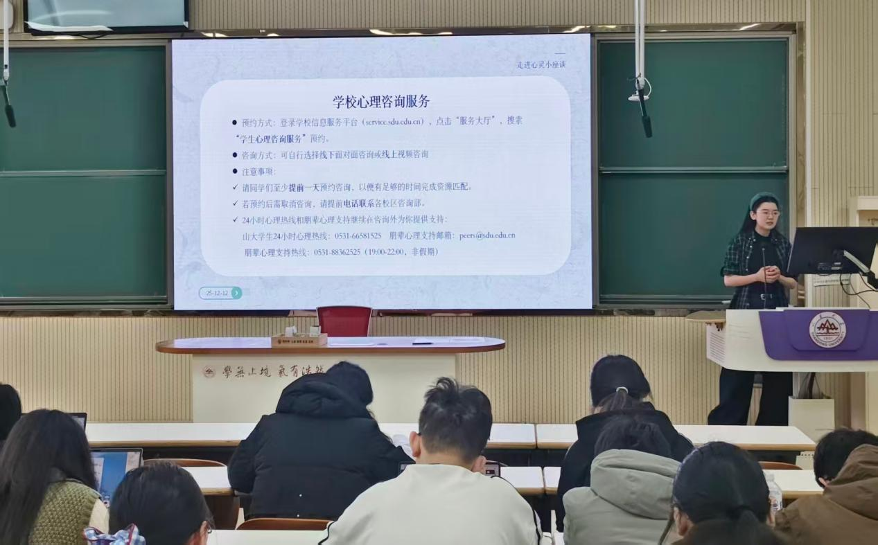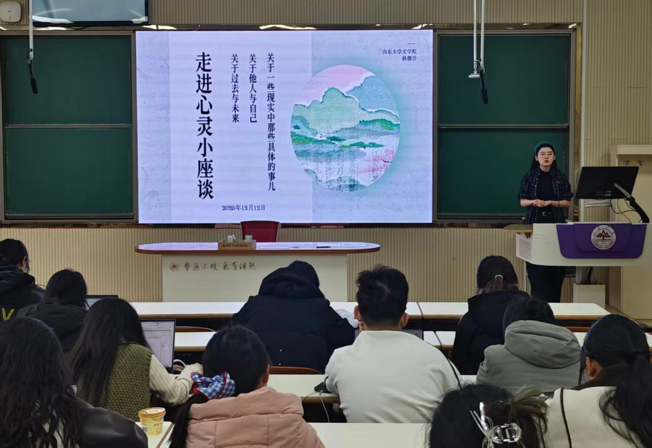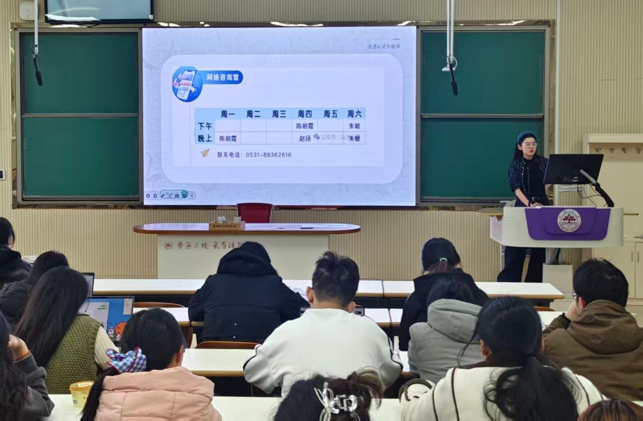 讲座伊始,孙雅乔结合当下同学们面对的普遍问题与心理状态,系统介绍了学校心理健康教育体系。她详细介绍了心理咨询预约途径与保密原则,鼓励同学们正视心理困扰,主动寻求专业支持。“心理健康与身体健康同样重要,主动求助是智慧与勇气的体现”,孙雅乔强调,学院也将持续通过谈心谈话、文暖心苑团体活动、主题小座谈等形式,为同学们提供及时、有效的心理支持,营造温暖包容的成长氛围。