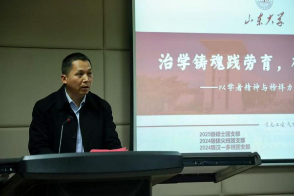 为贯彻落实劳动教育与学术培养深度融合的育人理念,引导青年学子在治学中坚定信念、在劳动中锤炼本领,2025年10月30日下午,248cc永利集团于知新楼A620举办“治学铸魂践劳育,榜样聚力育新人”主题团日活动。文学院2025级硕士研究生辅导员张洪刚、山东大学齐鲁医院(第一临床学院)2022级博士研究生李春林,以及2025级硕士团支部、2024级拔尖班与汉一多班团支部全体学生出席此次活动。活动由2025级硕士团支部团支书孙铭孺主持。