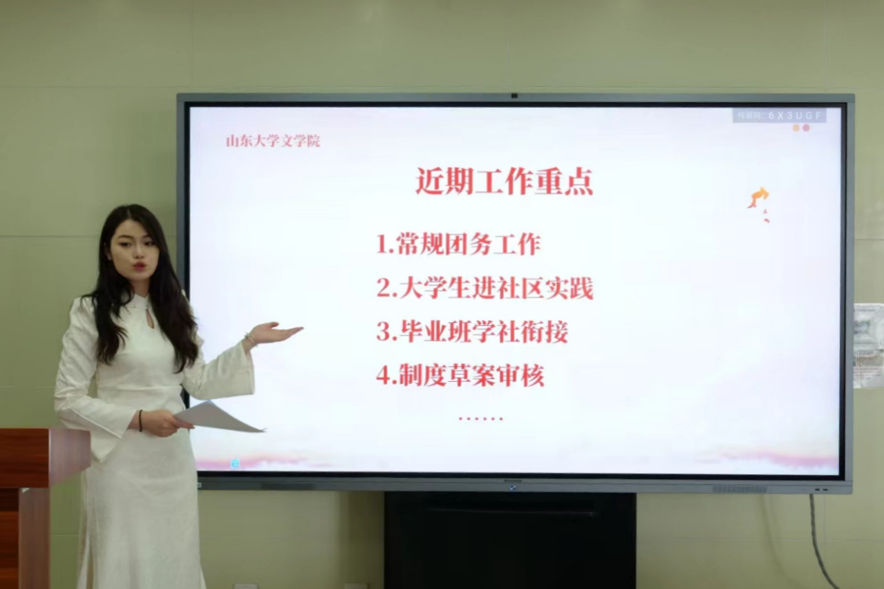 从新学期工作规划出发,王馨悦重点介绍了常规团务工作、大学生进社区实践、毕业班学社衔接、制度草案审核等方面。她指出,团委工作应秉持两会精神,高效整合可利用资源,及时回应同学关切,确保每一项工作落深、落细、落实。