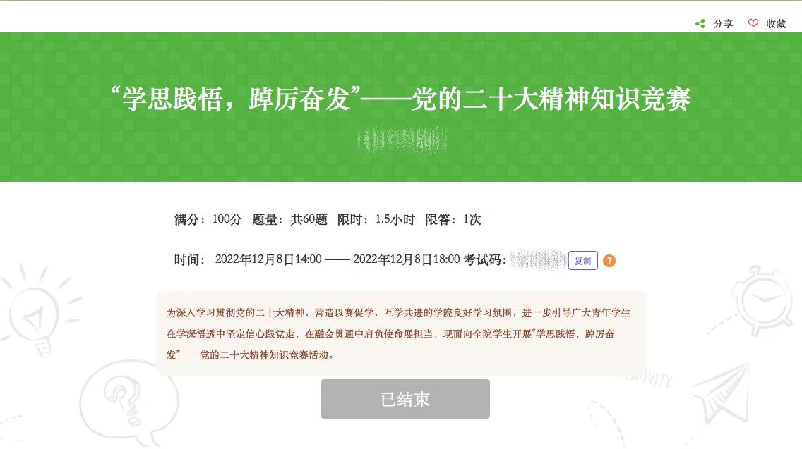 为深入学习贯彻党的二十大精神,营造以赛促学、互学共进的学院良好学习氛围,引导广大青年在学思悟行中坚定理想信念、筑牢精神之基、厚植爱国情怀,在院团委的指导下,我院硕士研究生第二、第五党支部和2022级硕士团支部于2022年12月8日面向全院学生开展了“学思践悟,踔厉奋发”——党的二十大精神知识竞赛活动。
