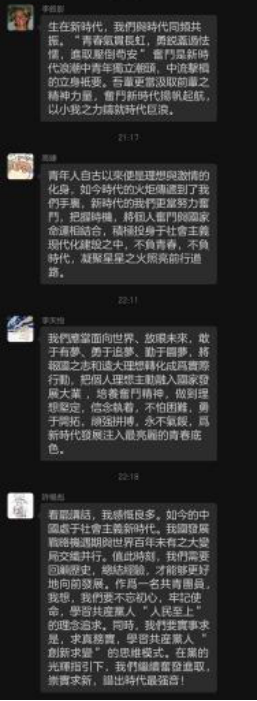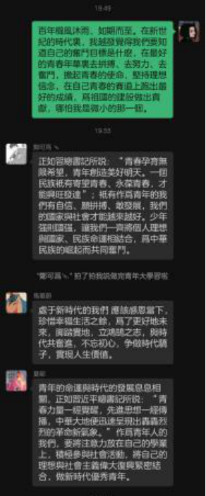 青年勇担当,锐意求进取。2020级中文基地班刘牧晨表示,作为青年团员,他深深地感受到领袖对我们的真挚关怀和殷切期望。共青团在党的领导下奋斗的这一百年,为我们留下了丰厚的制度、精神与历史经验的财富,是我们新时代青年再度出发、再建新功的重要基础。我们青年团员就该有一股“气”,这股“气”就是追求进步、永葆上进。我们明是非,深知今日的局面是怎样奋斗来的;我们敢担当,对先辈传下来的事业,有“舍我其谁”的气概;我们揣勇气、具方法,有创新突破的锐气,不断开创更好未来。这样的“我们”才是青春之“我们”,才无愧于青年团员之名。