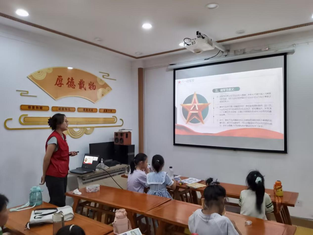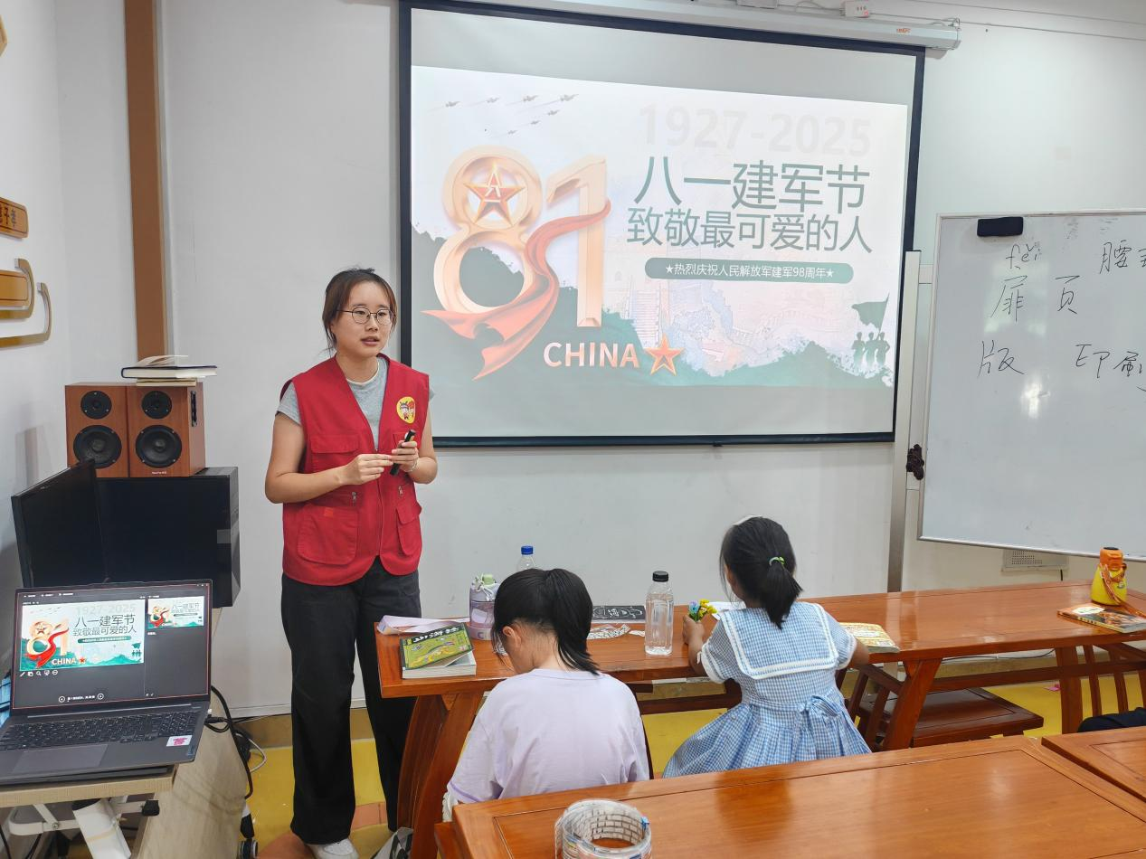 为庆祝中国人民解放军建军98周年,弘扬八一精神,8月1日,山东大学学生小树林支教调研团馥芽支教队走进济南平阴会仙山社区,开展八一建军节主题课程。课程以历史溯源、精神解码、英模致敬、诗词品悟为脉络,为社区儿童播撒红色种子,筑牢信仰根基。