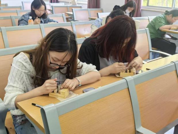 活动开始前,调研权益部邀请了山东大学鹊华印社的志愿者来为初次接触印章活动的同学们讲解了印章篆刻的发展历程和篆刻方法,帮助同学们更好、更安全地学习如何篆刻印章。活动中,同学们在刻刀与印石的碰撞中,一笔一画地篆刻出了专属的印记。活动现场氛围轻松融洽,大家专注于刻石之上,感受到了方寸之间的中华美学。