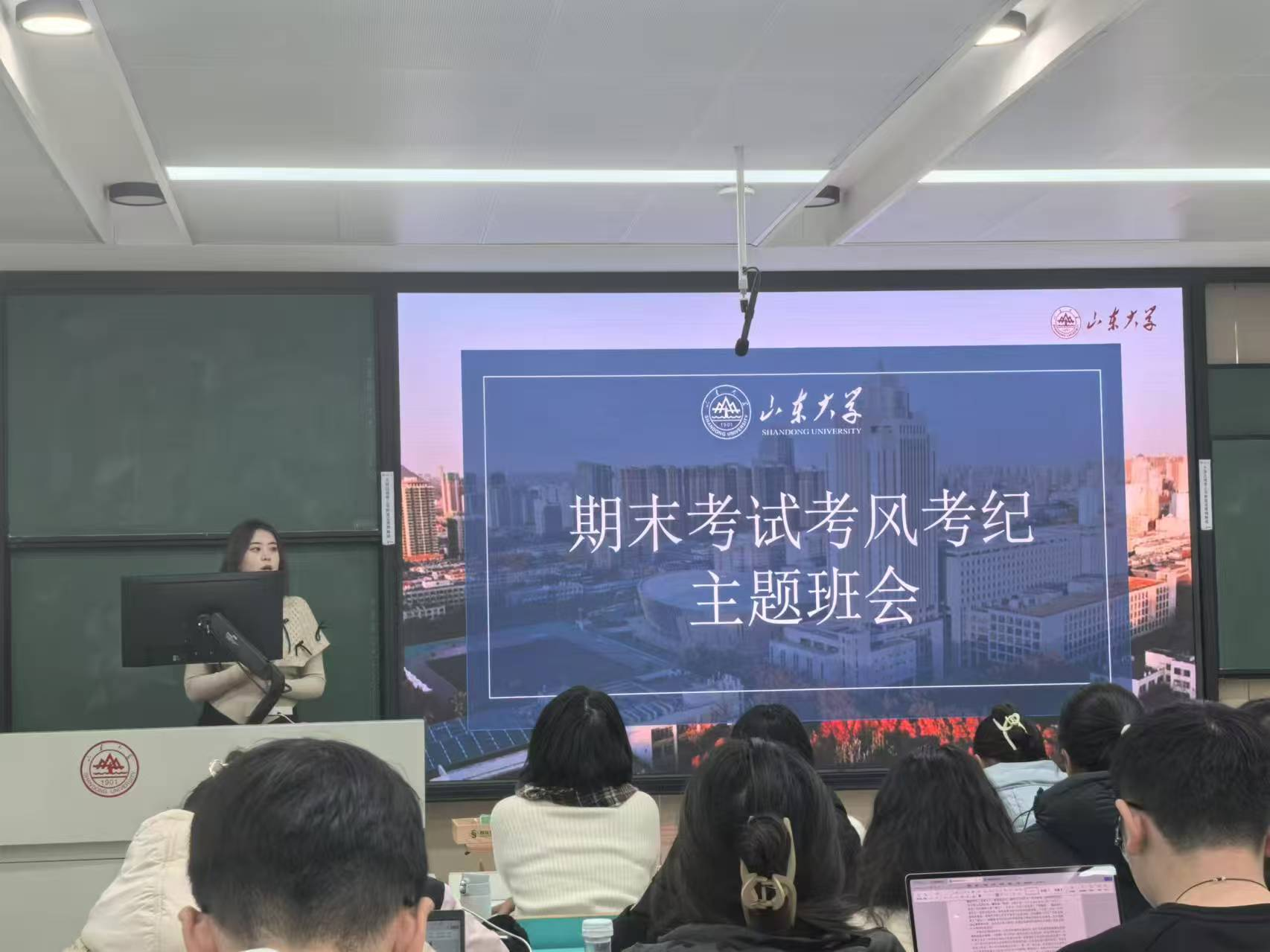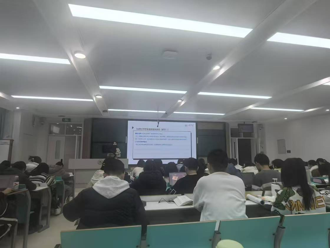 会议伊始,辅导员孙铭孺老师对大家的期末备考提出了几点建议:一是不要焦虑,保持轻松态度;二是及时复习,充分复习;三是合理选择自习地点。随后,孙铭孺老师强调了考生守则,包括提前20分钟进入考场、携带学生证身份证考试凭证参加考试及证件丢失补办流程、不得携带通讯工具及电子设备、严禁作弊行为、未交卷不得擅自离开考场、禁止将试题答卷草稿纸带出考场等相关规定,并再次强调了校规校纪《山东大学学生违纪处分办法(试行)》及案例警示。