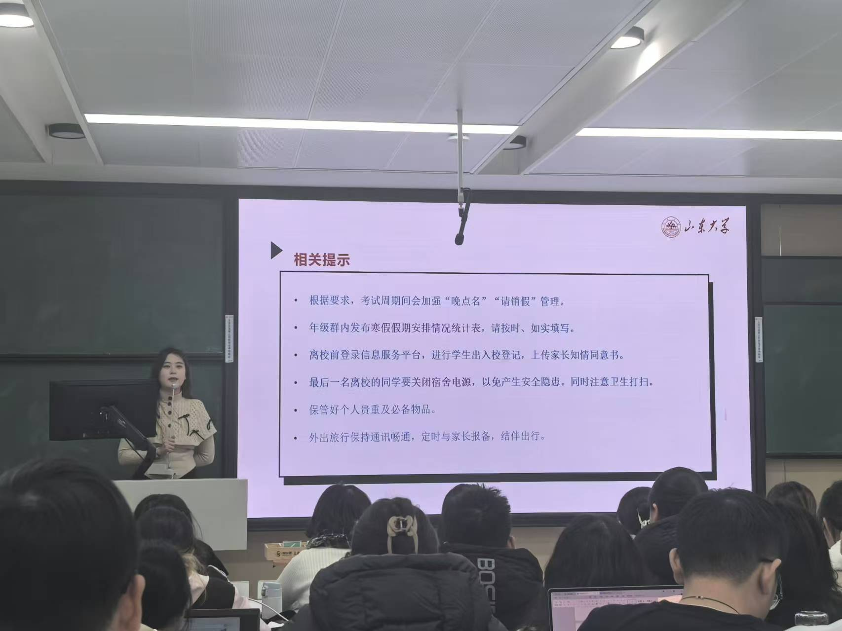 最后,孙铭孺老师介绍了假期安全警示及相关提示。所有考试科目结束后学生即可离校,但需要按要求填写寒假假期安排情况统计表、学生出入校登记。在宿舍方面,要尤其注意避免电器安全隐患和卫生问题,保管好个人贵重及必备物品。在外出方面,考试周期间会加强“晚点名”“请销假”管理,需要同学们注意门禁时间,合理安排出行计划,保持通讯畅通。