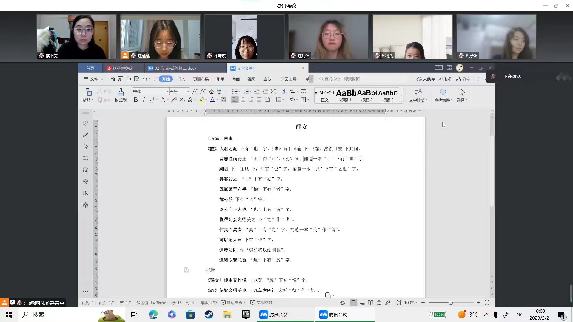 “灵犀”队共由5名文学院本科生及1名历史学院本科生组成。由于本次社会实践涉及到较多文献学知识,考虑到不同学院、不同年级的队员对文献学的了解程度不同,训练开始前,团队召开了线上会议,队员们就古籍版本、文言断句、繁体字辨识及任务分工等进行了详细交流。此次沟通丰富了队员们的相关知识储备,也为后续实践活动的开展提供了保障。
