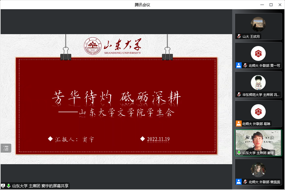 在北京师范大学文学院学生会的主持下,与会高校代表依次进行发言,详细介绍了各自学生会的情况,并分享了相关工作经验。窦宇以“芳华待灼、砥砺深耕”为主题,从组织改革、思政教育、媒体宣传、五育并举和活动创新五个方面充分介绍了248cc永利集团学生会发展情况。