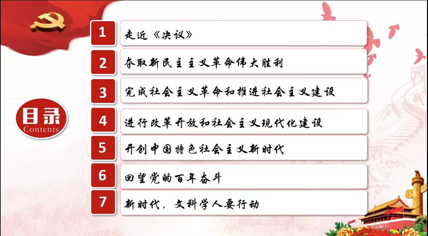 此次团课宣讲从四个部分,七个章节展开。首先由20级本科生王晴带领大家学习《中共中央关于党的百年奋斗重大成就和历史经验的决议》,她充分强调了《中共中央关于党的百年奋斗重大成就和历史经验的决议》对于广大青年学子正确全面的认识党的百年奋斗史,坚定实现中华民族伟大复兴的决心的重要作用。随后20级本科生刘牧晨立足具体事实,把握关键特征,对党在四个不同历史阶段的辉煌奋斗进行了讲解。在回顾各阶段中国达成的历史性成就的基础上,观照党的路线、方针、政策,体会其中蕴含的马克思主义的真理光芒。同时又立足实际,结合习近平给《文史哲》编辑部全体编辑人员的回信,提出了新时代文科学人怎样做出贡献、应该做出怎样的贡献的回答。