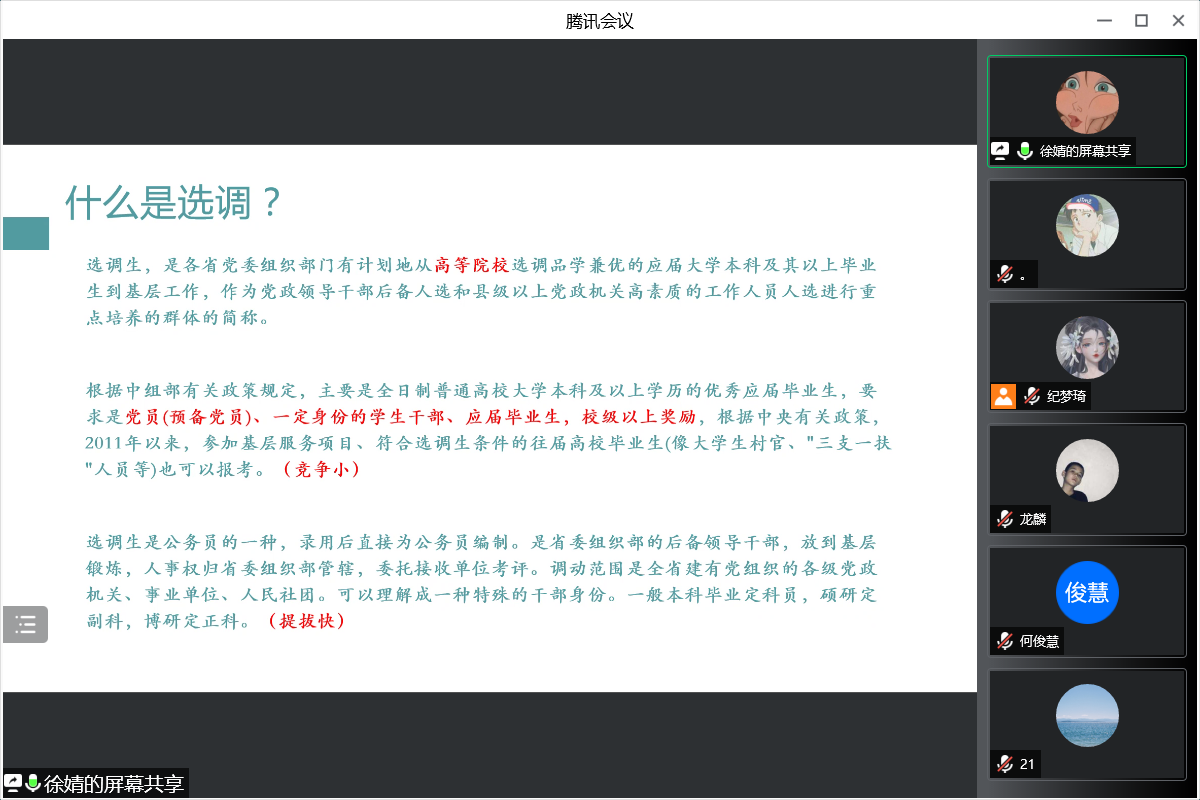 本次就业经验分享会邀请了248cc永利集团两位通过定向选调并已在所选单位入职的2021届毕业生。其中,徐婧就职于黑龙江省公安厅,何俊慧就职于广西壮族自治区防城港市纪委监委。会议由248cc永利集团本科生龙麟主持,近百名学生参与。