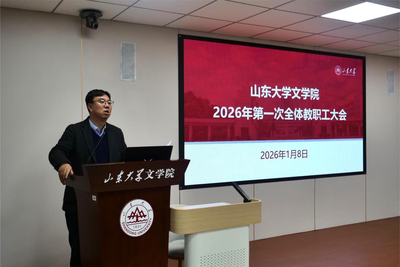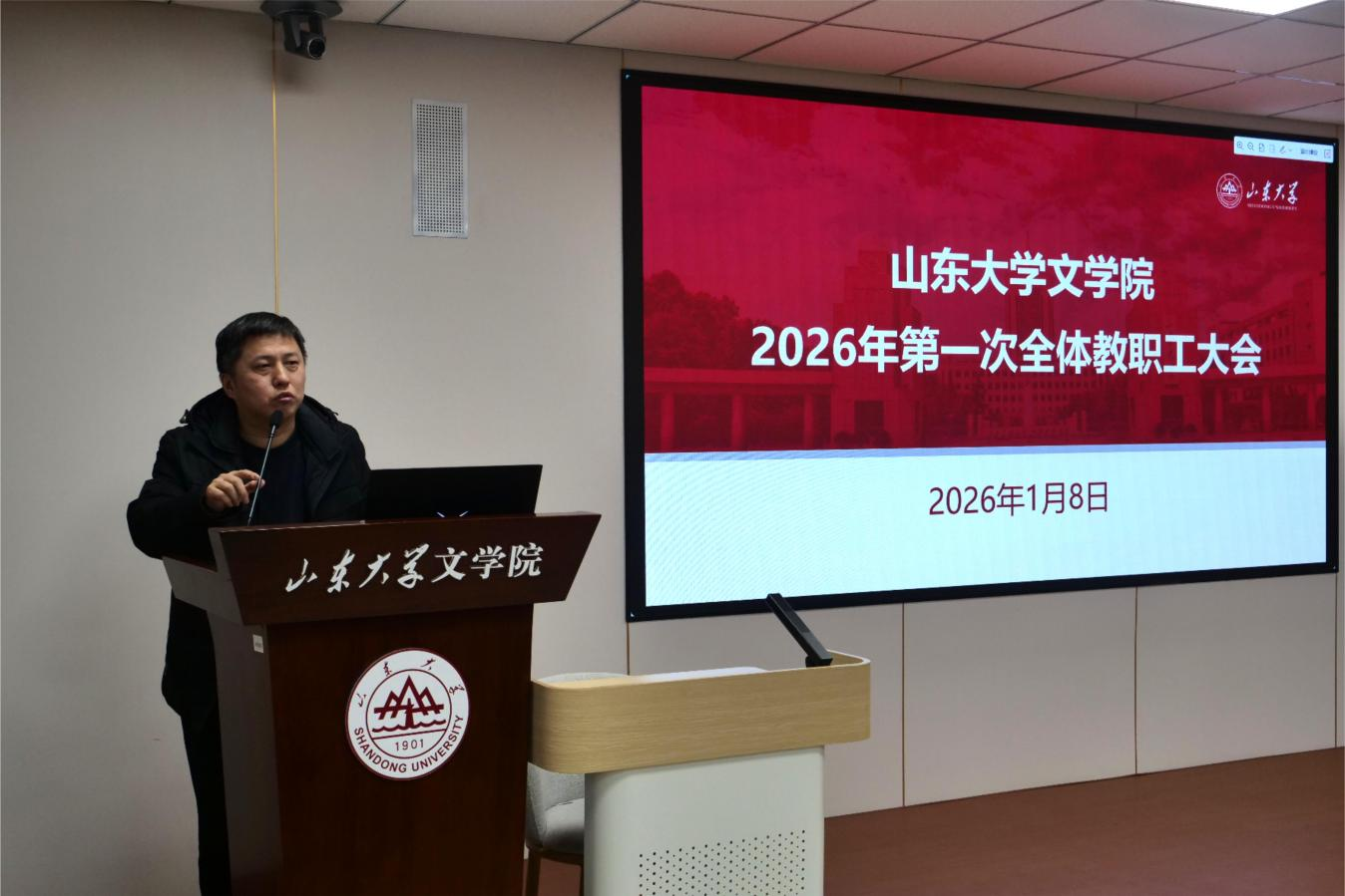 1月8日下午,248cc永利集团于知新楼A620召开2026年第一次全体教职工大会。会议由248cc永利集团党委书记郭春晓主持。院长黄发有,院党委副书记王萌、杨俊娇,副院长杨建刚、樊庆彦、王辉,副处级组织员沈文及全体教职工参加会议。