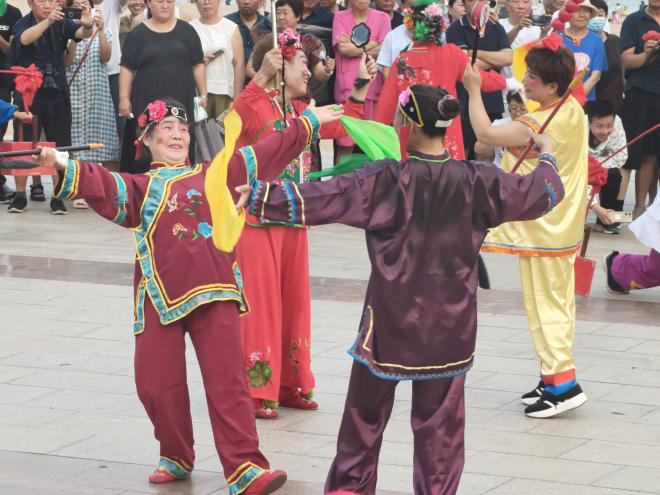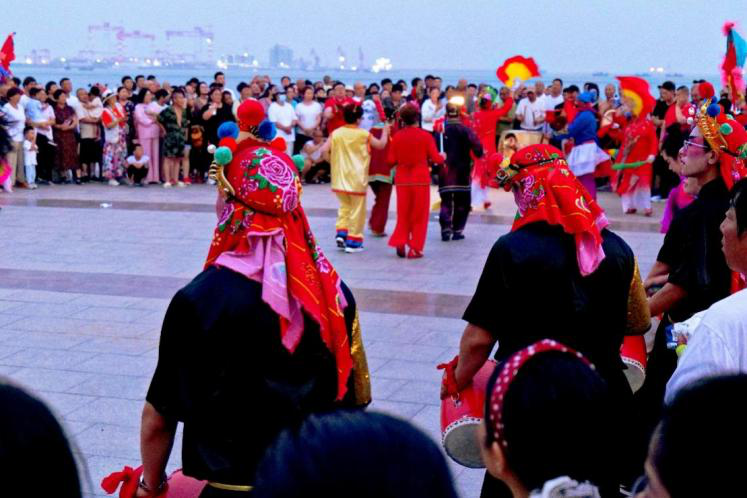 海阳市拥有深厚的民俗底蕴与独特的地域文化,海阳大秧歌作为国家级非物质文化遗产,是当地文化的鲜活缩影。7月6日下午,调研团队首先前往海阳大秧歌表演现场凤凰广场。在铿锵的锣鼓声中,感受海阳大秧歌的欢快热烈。通过与当地秧歌艺人的深入交流,同学们进一步了解了大秧歌的艺术特质、组织形式以及与之有关的饮食文化、历史事件。通过当天的初步考察,团队深切体会到海阳民俗文化的蓬勃生命力和在当地的影响力,为后续的方言调查积累了必要的文化知识。
