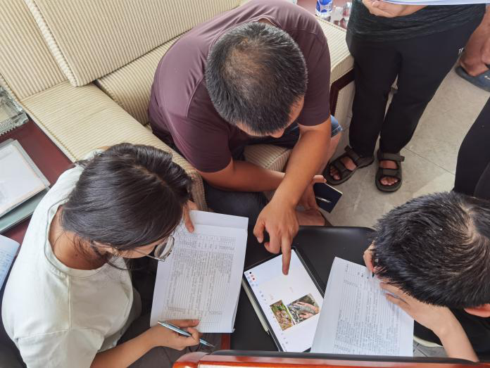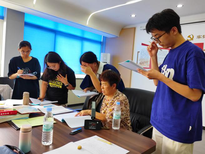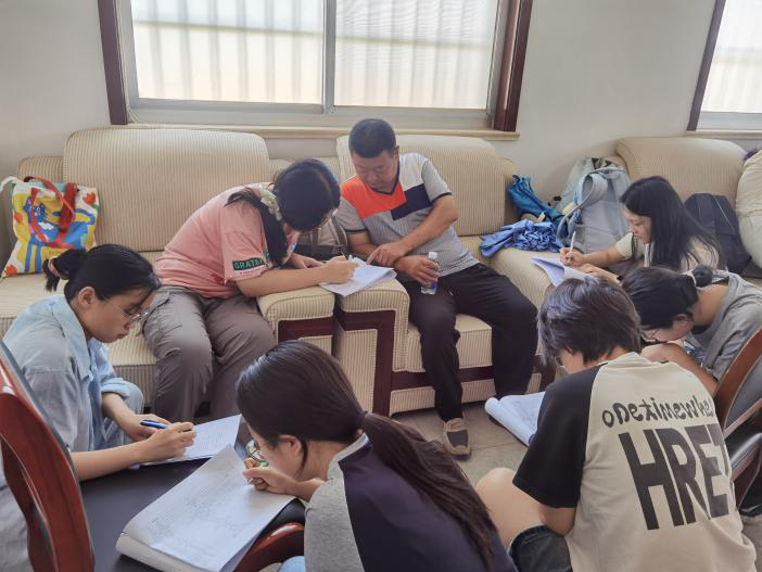 7月7、8、9日以及11日的上午,是课程最核心的方言调查部分。团队邀请了来自东村街道南才苑村的两位发音人,围绕海阳方言单字音系、单字记音以及及连读变调、轻声、儿化、“子”缀等方言现象展开了系统调研。调查过程中,师生围坐一堂,仔细聆听方言发音特点并使用音标符号加以记录。在调查过程中,当地的声调系统比较复杂,部分音节的声调调值仅存在细微的差异,团队成员反复听辨、多次确认,力争准确标注。每日调查结束后,团队同学在老师指导下及时整理数据,归纳音系特征与变调规则,逐步构建起海阳方言的语音系统框架。同时,同学们还在音系调查中深入了解了规范的方言调查程序,夯实了汉语方言学的听辨音技巧,提高了田野调查的实践能力。