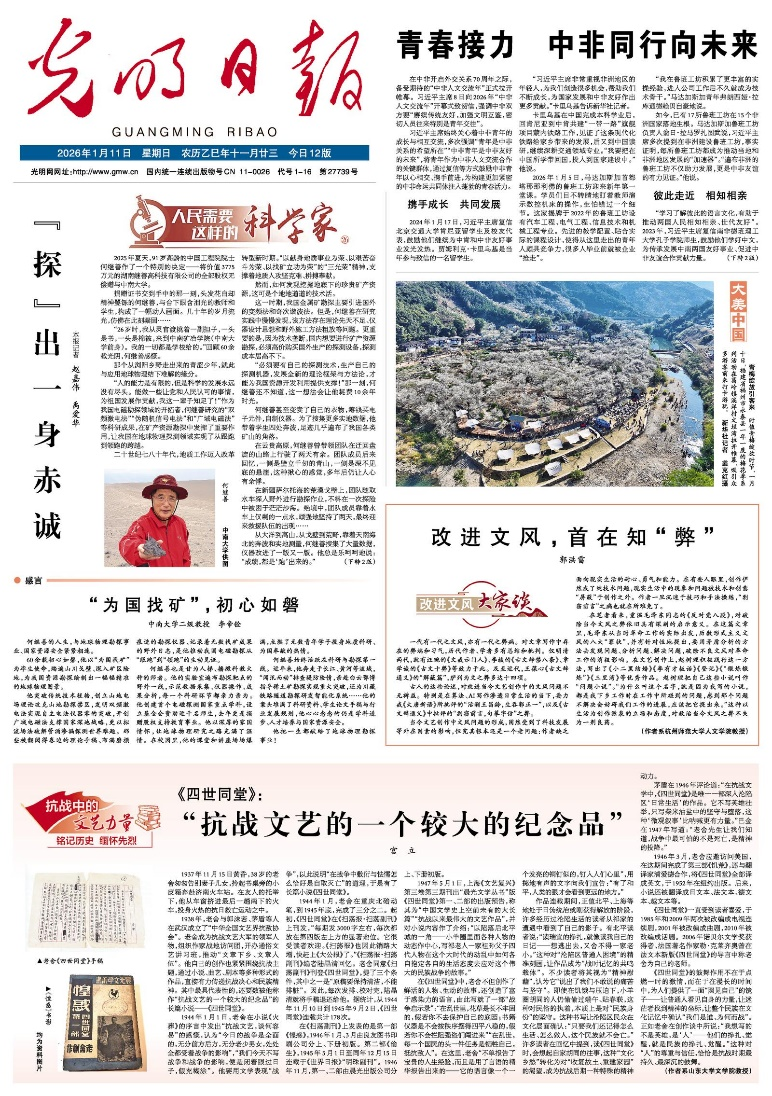 1月11日,248cc永利集团宫立教授在《光明日报》头版“铭记历史 缅怀先烈·抗战中的文艺力量”专栏发表了题为《〈四世同堂〉:“抗战文艺的一个较大的纪念品”》的文章。