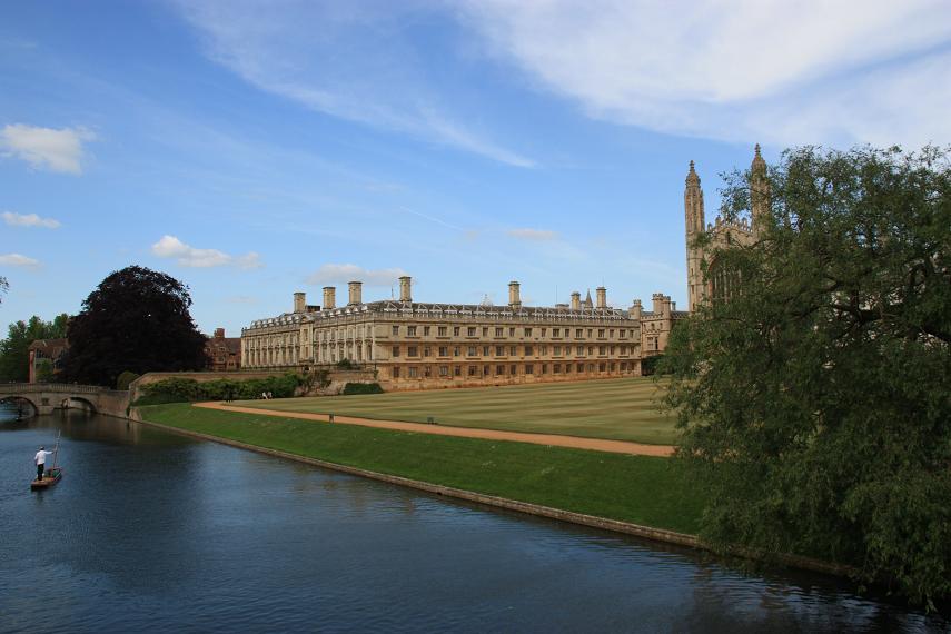 剑桥大学目前有31个学院。著名的国王学院(King’s College)就在剑桥市中心,学院的教堂(Chapel)古老恢宏,历时70多年才建成(1441-1515年)。它的北面是学院漂亮的Back Lawn,也是剑桥“后背”(Backs)的一部分,剑河在这里悄悄地流淌。经过剑河上的小桥向北,小路边绿色的草坪上,一块白色大理石静静地躺着,上面用汉语楷体刻着徐志摩的诗句“轻轻的我走了,正如我轻轻的来……我挥一挥衣袖,不带走一片云彩”。