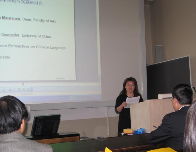图为6月18日在芬兰赫尔辛基汉语教学与研讨会上发言