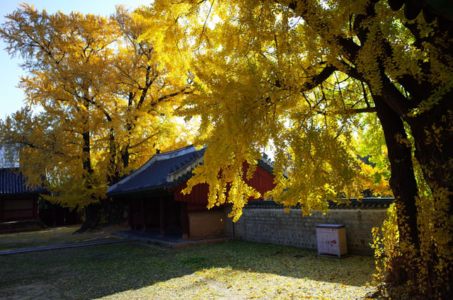 成均馆成立于1398年,是朝鲜王朝的最高国立教育机关,也是韩国教育的发源地。成均馆大学含有两个校区,自然科学校区位于首尔的卫星城水原市,由作为学校财团的三星集团投资建设;首尔市内的本校则变成了人文与社会科学校区。在本校区内,有至今保存完好的文庙。每年在孔子诞生日都要举行祭孔大典,一众师生盛装列队,击鼓鸣琴,作八佾之舞。据说一招一势皆取自曲阜孔庙所演大礼。来自各地教育部门的官员和教师或坐或立,肃然围观。作为看客伫立期间,冥思恍惚,一时竟不知身在何处。然而奇怪的是,文庙里平日却是异常清静,虽与校园只一墙之隔,且庙门昼夜开放,但极少看到师生的身影,倒是成群的鸽子四处觅食,给人门可罗雀的感受。刚来时我对此也有所不解,但后来看到校园里学生匆匆的脚步和漠然的神情,多少知道了些原因。在韩国,青年人的生活压力大、生活节奏快,学生们除了完成学业,还要打工挣钱。长期休息不好、睡眠不足,少有闲情逸致停下来看一眼周围的风景。说到风景,其实文庙里的两棵千年银杏树甚为可观,深秋时节,满树金黄。顺带提一句,成均馆大学的校徽图案就是一枚银杏树叶。