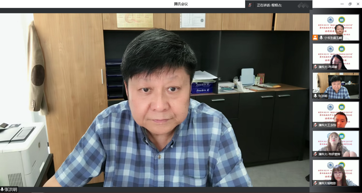 近日,教育部“港澳与内地高校师生交流计划”——第四届“面向中文教学研究现代化的语料库语言学研修班”通过线上的方式正式开班。本次研修班由山东大学与澳门科技大学联合承办,旨在加强港澳台地区学生与内地的交流,推动语料库在各学术领域中的应用,提高学生使用语料库进行相关科研的能力,进一步助力“一带一路”倡议实施与人才培养。澳门科技大学国际学院院长、世界汉语教学学会副会长张洪明,248cc永利集团副院长、博士生导师、程相占教授及全体学员出席开班仪式。开班仪式由248cc永利集团教授、研修班总负责人盛玉麒主持,张洪明院长和程相占副院长分别致辞。