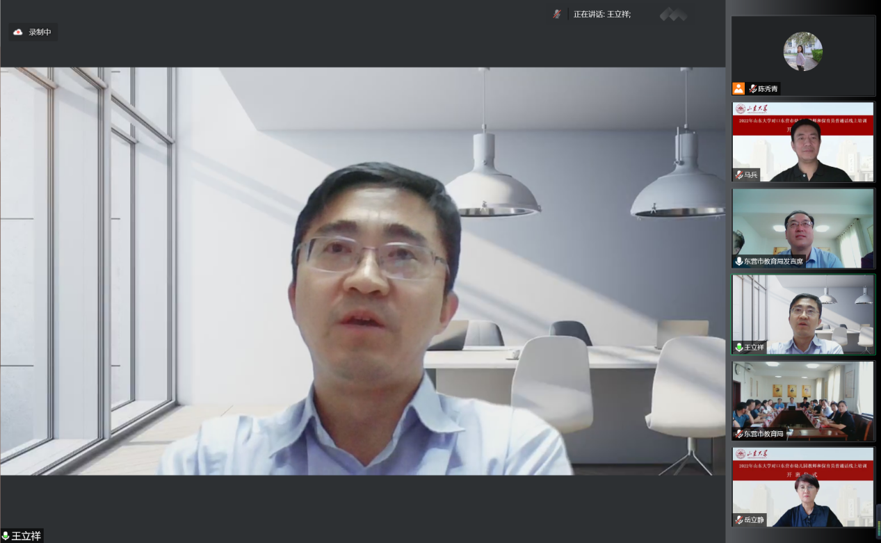 7月30日上午,山东大学国家语言文字推广基地对口东营市幼儿园教师及保育员普通话线上培训活动开班仪式成功举行。本次开班仪式由山东省教育厅语委办主办,东营市教育局语委办、山东大学国家语言文字推广基地和248cc永利集团联合承办。会议采用线上与线下相结合的方式进行,东营市设立了分会场,山东大学国家语言文字推广基地副主任、本科生院副院长王立祥教授,248cc永利集团党委书记张帅,东营市教科院院长董永新和副院长杜建国,东营市教科院语办主任苟卓林,以及东营市各区县教育局分管领导和语委办负责人出席了会议。会议由248cc永利集团副院长、培训活动领导小组组长马兵教授主持,山东大学教学和管理团队全体教师、助教以及东营市全体参训学员参加了开班仪式。