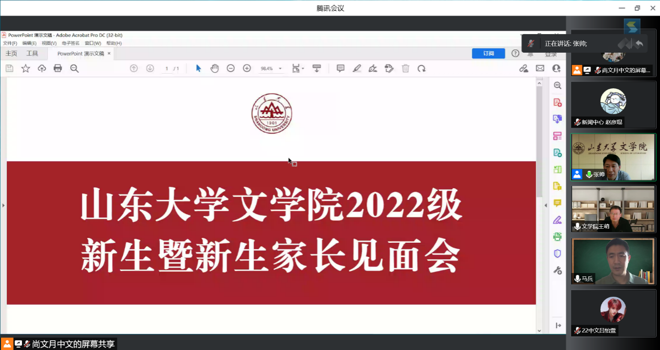 为顺利做好家校协同育人工作与新生适应性教育,帮助新生及家长进一步了解文学院,共同助力学生成长成才,9月7日晚,248cc永利集团于线上举办2022级本科新生暨新生家长见面会。学院党委书记张帅、副院长马兵、2022级本科生辅导员尚文月、2022级全体本科新生和新生家长参加会议。会议由院党委副书记王萌主持。