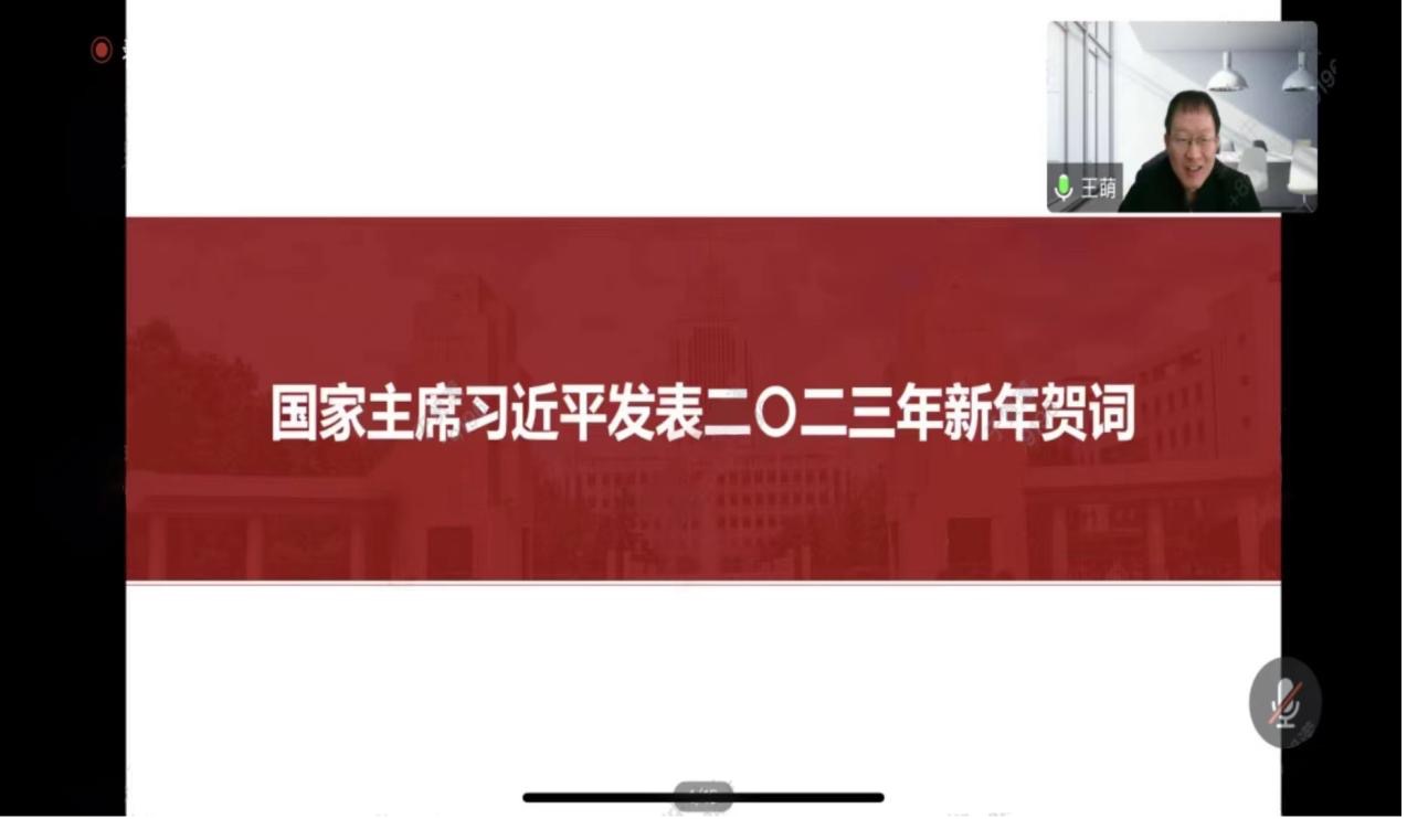 会上,王萌领学了习近平总书记发表的二〇二三年新年贺词。王萌指出,习近平总书记在新年贺词中回顾了过去一年党和人民走过的不凡征程,宣示了把新时代中国特色社会主义事业不断向前推进的坚定决心和必胜信心,描摹了中国繁荣发展的美好图景,并号召全党全国各族人民团结奋斗,共创光明未来。