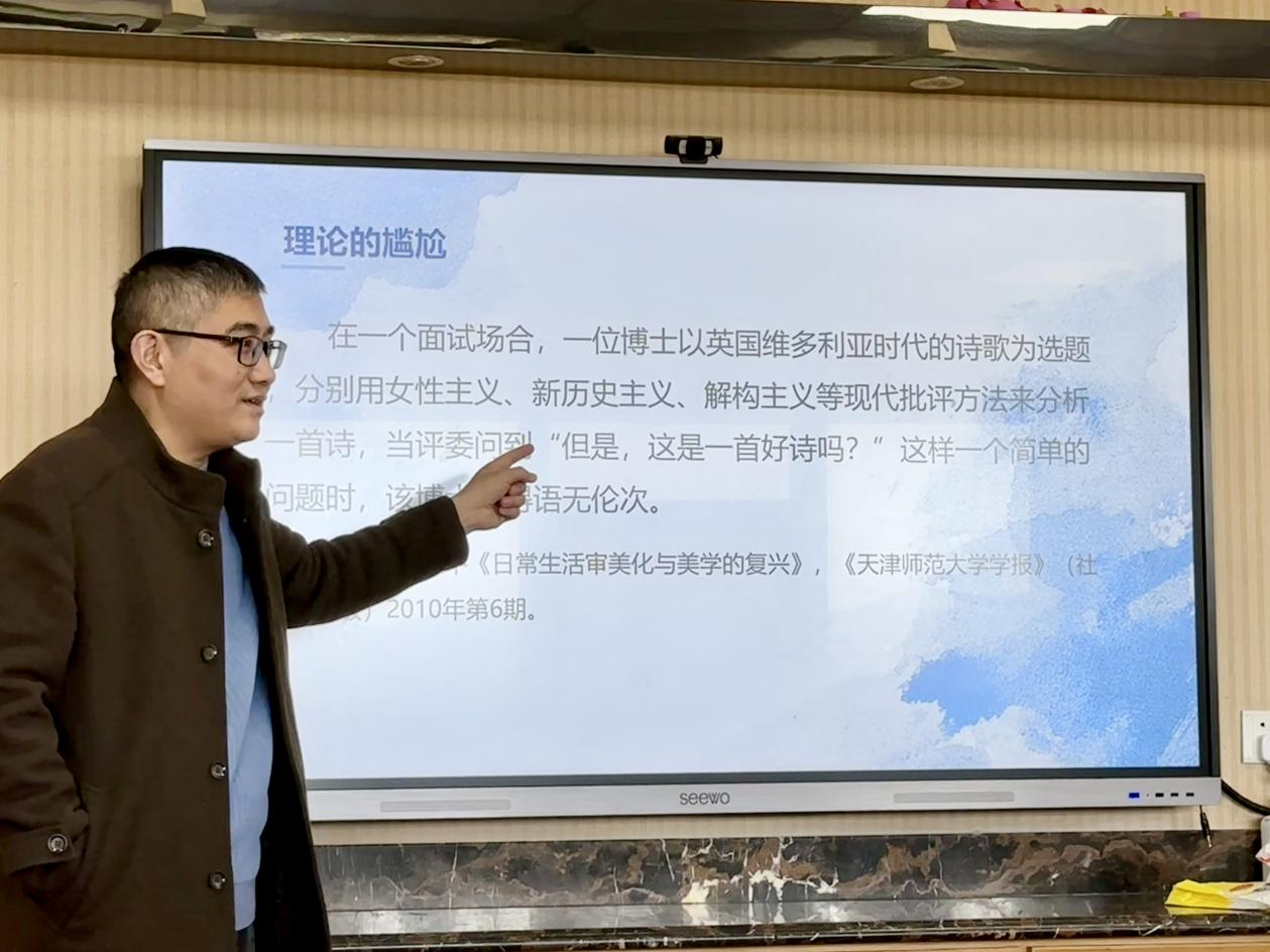 接着,韩清玉教授通过分析世界名画《日出•印象》随着时间推移产生的两种截然相反的评价,引导同学们更深入地思考“什么是美”这一问题,进而深入阐释了文艺美学批评效用。他指出,“美”有广义和狭义之分,广义美是指一个事物引起了人的审美兴趣和情感,而狭义美主要是指“优美”。他强调,文艺美学的研究主要是从广义美出发的。同时,韩清玉教授也提到当今许多后现代主义“奇怪”的“新花样”和“美国人最喜欢的一幅画”等有趣的实例。通过一个个生动现实的例子,让同学们对文艺美学有了更深一步的认识。