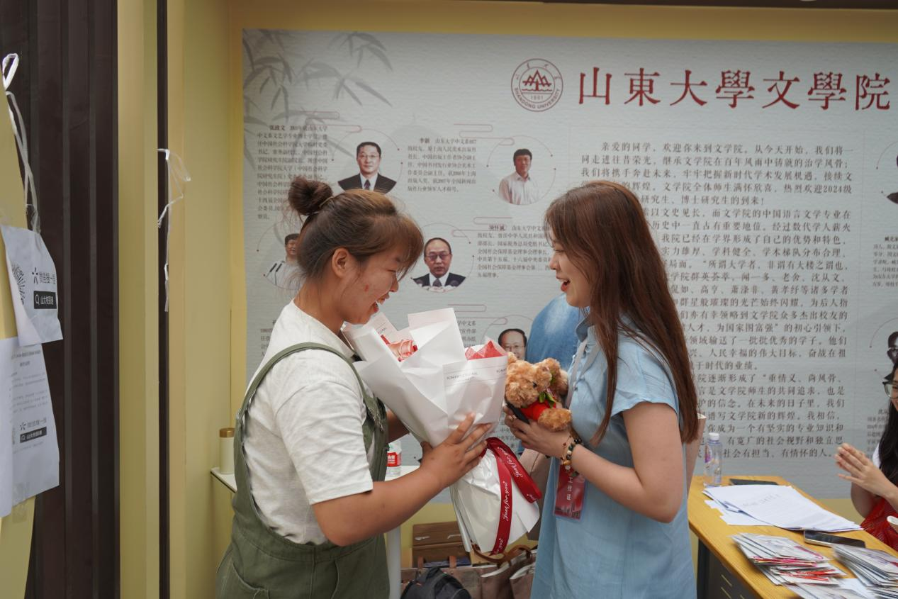 迎新过程中涌现的温馨瞬间,生动诠释着248cc永利集团对学生的关心与关怀。本科新生郭珂嘉在报到当天恰逢生日,辅导员孙铭孺代表学院为她送上鲜花和学院文创玩偶,现场迎新工作人员齐声唱响生日歌,传递浓浓的生日祝福。研究生新生辅导员宋海涛则亲自带领中国古代文学专业新生徐辰杰完成报到流程,并送上新生大礼包。两位同学对学院和老师表达了感谢之情,同时还表示要在今后的大学生活中勤奋努力,争做优秀文院人。