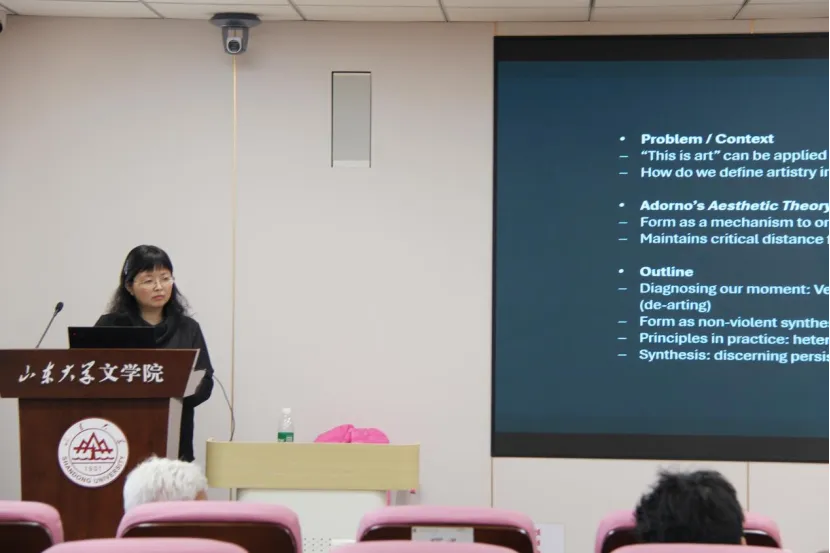 11月20日上午,山东大学国际前沿学术讲座第8期在中心校区知新楼A620会议室举行,德国卡塞尔大学美学与普通艺术科学系副教授王卓斐作“反对‘一切皆艺’:阿多诺形式概念作为当代艺术的批判工具”的主题学术讲座。