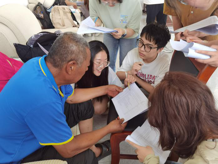 7月7、8、9日以及11日的上午,是课程最核心的方言调查部分。团队邀请了来自东村街道南才苑村的两位发音人,围绕海阳方言单字音系、单字记音以及及连读变调、轻声、儿化、“子”缀等方言现象展开了系统调研。调查过程中,师生围坐一堂,仔细聆听方言发音特点并使用音标符号加以记录。在调查过程中,当地的声调系统比较复杂,部分音节的声调调值仅存在细微的差异,团队成员反复听辨、多次确认,力争准确标注。每日调查结束后,团队同学在老师指导下及时整理数据,归纳音系特征与变调规则,逐步构建起海阳方言的语音系统框架。同时,同学们还在音系调查中深入了解了规范的方言调查程序,夯实了汉语方言学的听辨音技巧,提高了田野调查的实践能力。