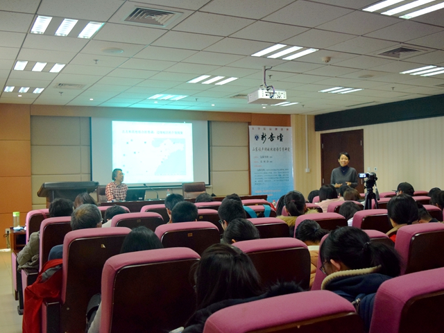 首先,刘娟对远藤光晓的远道而来表示感谢,并简要介绍了远藤光晓的学术研究和学术经历,同时希望在座的各位同学可以认真聆听本次讲座,能从中有所收获。讲座伊始,远藤光晓先向大家介绍了本次报告的主题,即多年来他对山东话声调从地理语言学角度进行的研究和探索。接着,他介绍自己是如何把地理学上的“时间序列地图”的概念,借用到对整个东南亚语言的研究中,即用同一个地区不同时期的语言地图,来显示语言历时的演化。在对山东话的研究中,他在上百个地点的空间维度上和三个时段的时间维度上生动地展示了山东方言单字调70年来的历时变化。特别值得关注的是在调类问题的研究上,他发现19世纪40年代山东半岛莱阳、即墨等地还保持阴去、阳去调类的对立,据此他推测50年代以后平度型的声调系统可能曾经也是分阴阳去的声调系统,后来分别按照调值的近似性分归阴阳平。这可能是平度型今去声两读的直接根源。最后,远藤光晓又报告了他对山东方言变调研究的最新成果。虽然这些成果还是初步的、阶段性的,但同样显示了他对这一问题在空间和时间两个维度上的宏观研究思路。