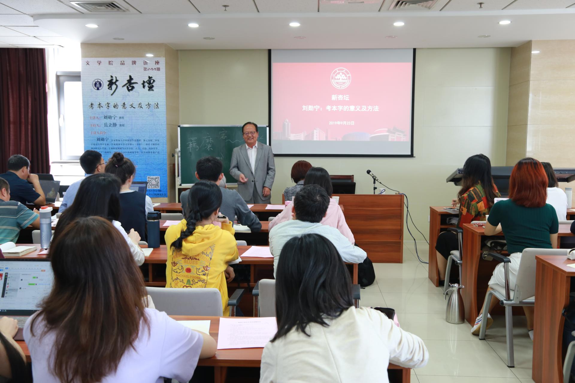 9月23日上午,日本明海大学外国语学部教授、博士生导师刘勋宁做客248cc永利集团新杏坛,在知新楼A606为248cc永利集团学生作学术讲座。讲座由岳立静教授主持,钱曾怡教授、刘文副研究员、寇鑫副研究员出席本次讲座。