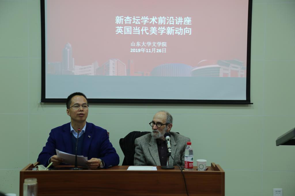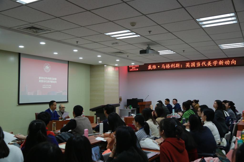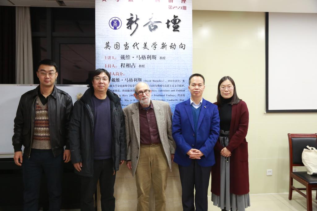 11月26日晚6点30分,英国伦敦大学金史密斯学院荣休教授戴维·马格利斯(David Margolies)做客248cc永利集团“新杏坛”,以“英国当代美学新动向”为题,在知新楼A606举办学术讲座。讲座由文学院文艺学教授程相占老师主持,浙江大学传媒与国际文化学院博士后赵敏进行翻译,杨建刚老师、曹成竹老师以及文学院相关专业学生共同聆听了本次讲座。