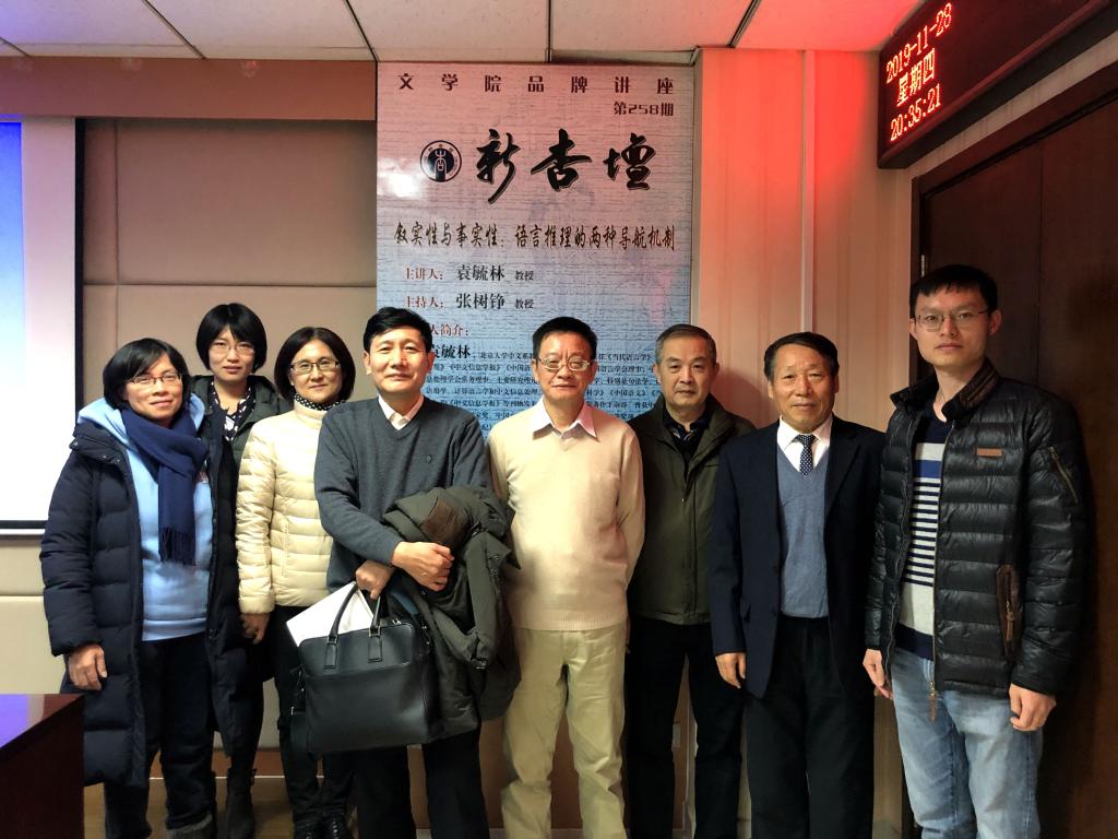 11月28日晚6:30,北京大学袁毓林教授做客248cc永利集团“新杏坛”,在知新楼A620举办了题为“叙实性与事实性:语言推理的两种导航机制”的讲座。讲座由文学院张树铮教授主持,众多师生共同聆听了本场讲座。张树铮在讲座开始前对袁毓林进行了简明扼要的介绍,并代表文学院师生对袁毓林的到来表示热烈欢迎。