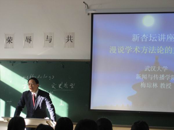 近日,武汉大学新闻与传播学院教授梅琼林先生做客新杏坛讲座,为同学们做了一场题为“漫说学术方法论的文史哲型”的精彩学术报告。这也是新杏坛讲座首次在兴隆山校区举办,中文专业2010级的一百余名同学怀着极大的热情参加了这次活动。